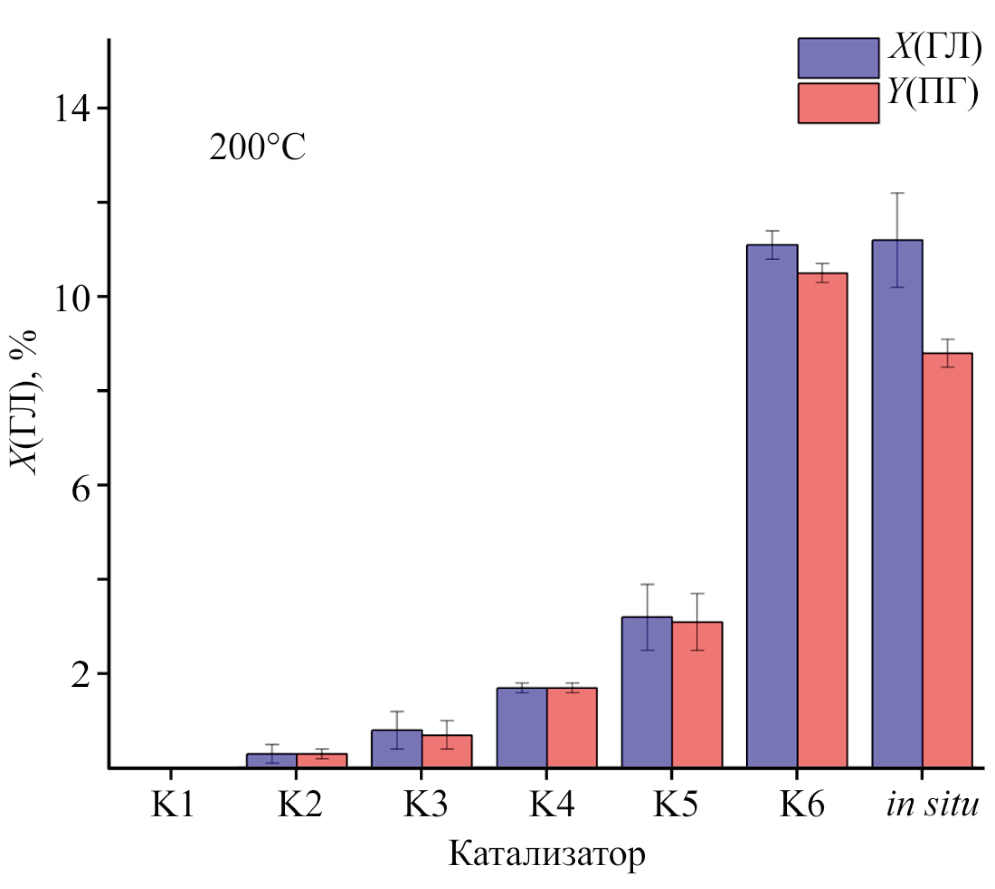 Результаты каталитических тестов, проведенных при 200°С с использованием катализаторов К1–К6 и катализатора, сформированного in situ, приведены на рис. 1. Для отечественного катализатора К1 превращения ГЛ в заданных условиях не наблюдалось (XГЛ = 0%), для отечественного катализатора К2 XГЛ была очень мала – 0,3%. Для лабораторного катализатора К3 и зарубежных К4 и К5 XГЛ тоже была мала – 0,8, 1,7, 3,2% соответственно. Наибольшие значения конверсии ГЛ, равные 11,1 и 11,2% соответственно, были достигнуты для зарубежного катализатора К6 и катализатора, сформированного in situ. При этом следует отметить, что селективность по ПГ в случае К6 составила 95%, в то время как для in situ катализатора – 79%.