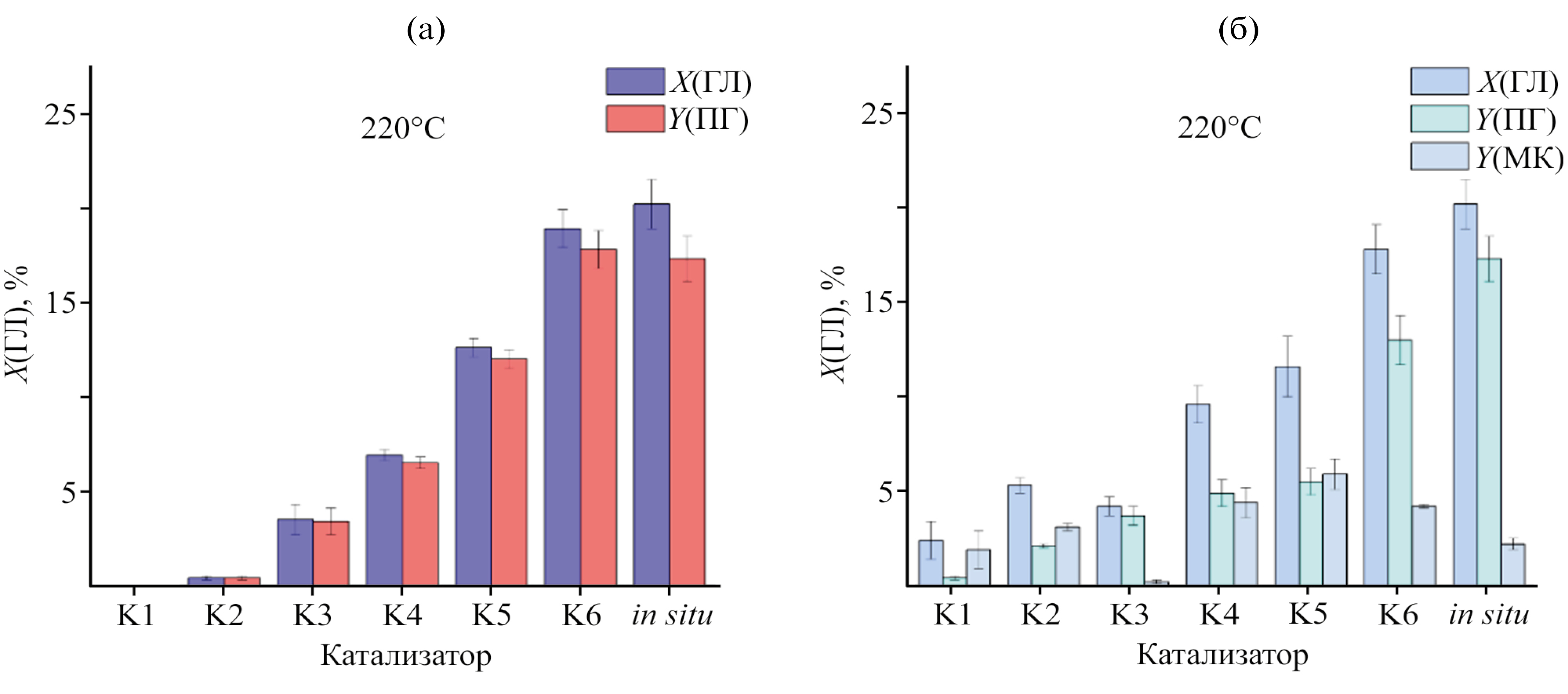 Для температуры 220°С активность катализаторов также возрастала в ряду К1 < K2 < K3 < < K4 < K5 (рис. 2a). В сравнении с зарубежным катализатором К6 и катализатором, сформированным in situ, XГЛ была чуть выше в случае in situ-катализатора и равна 18,9 и 20,2% соответственно. При этом YПГ были очень близки: для К6 – 17,8, для in situ – 17,3%. Добавка 3 экв. KOH (рис. 2б) к катализаторам К1–К6 позволила повысить XГЛ для катализаторов К1–K4. Для катализатора К1, который был абсолютно не активен без KOH (XГЛ = 0%), конверсия выросла до 2,4%. Однако рост наблюдался за счет увеличения YМК, который составил 1,9%. Для катализатора К2 добавка KOH увеличила YПГ с 0,4 до 2,1% и XГЛ с 0,4 до 5,3%. В случае К3 XГЛ выросла с 3,5 до 4,2%; при этом YМК составила всего 0,2%. Для катализатора К4 XГЛ увеличилась с 6,9 до 9,6%, вместе с тем SПГ упала с 94 до 51%. В случае катализаторов К5 и К6 добавка 3 экв. KOH не приводила к значительным изменениям XГЛ, в то же время селективность по ПГ снизилась.