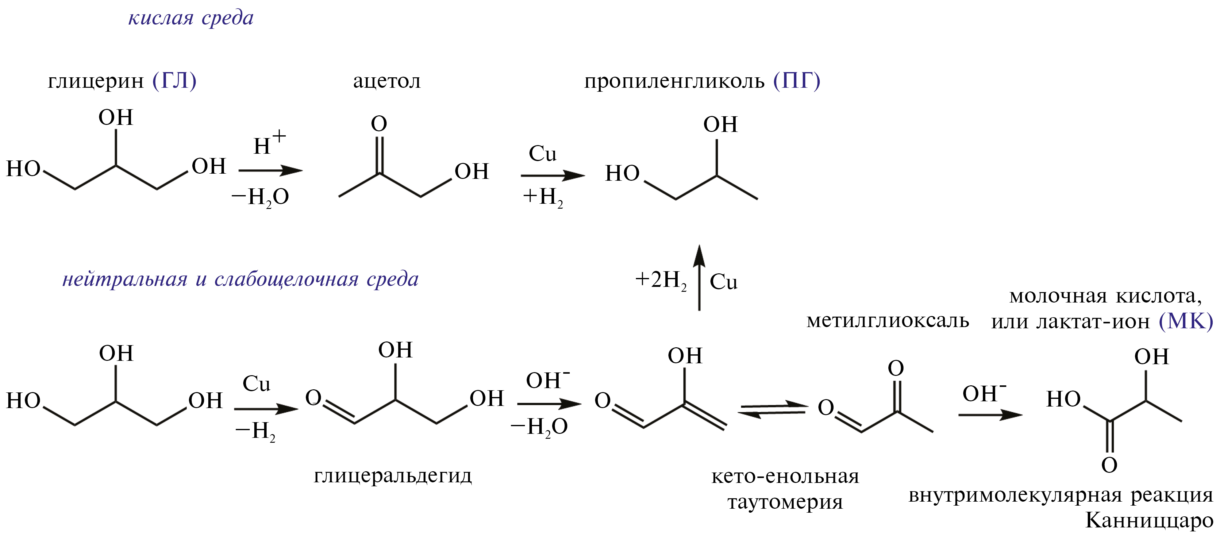 Предполагаемый механизм гидрогенолиза ГЛ с получением ПГ подробно описан в нескольких работах [1, 2]. В зависимости от среды реакции (кислая, нейтральная или слабощелочная) он протекает по по разным маршрутам (схема 1).