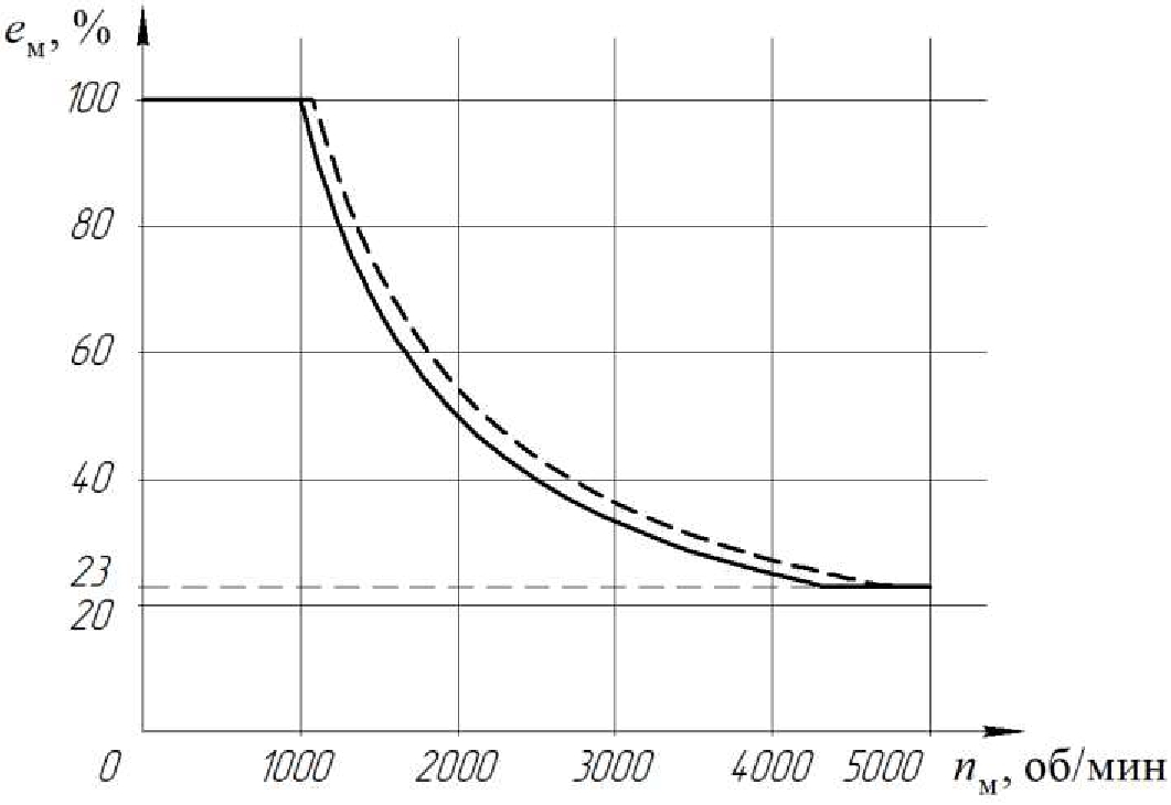Рис. 8. Итоговая зависимость относительного рабочего объема гидромотора от частоты вращения вала гидромотора (сплошная линия), исходная завсисмоть (пунктир)