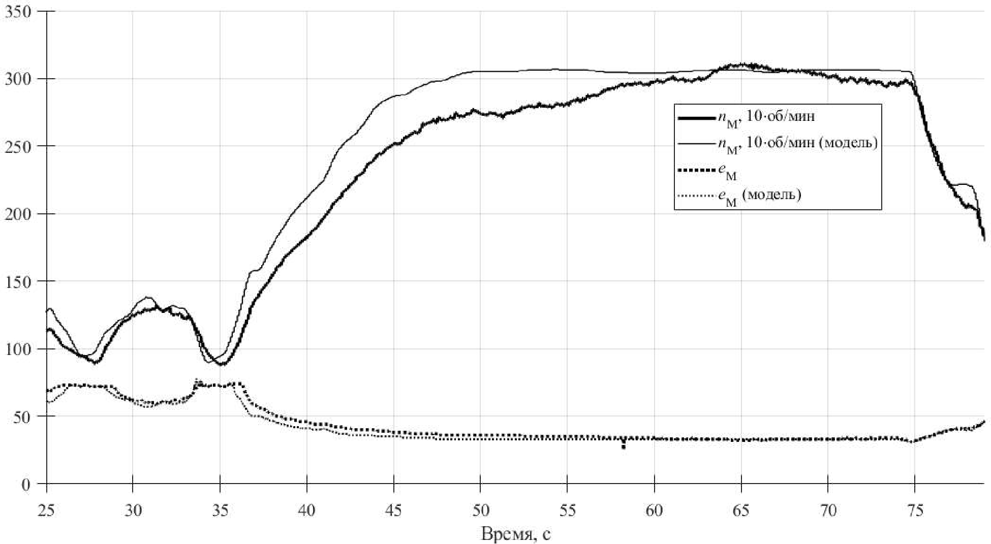 Рис. 9. Частота вращения вала гидронасоса и степень нажатия на педаль ускорения в натурном и вычислительном эксперименте
