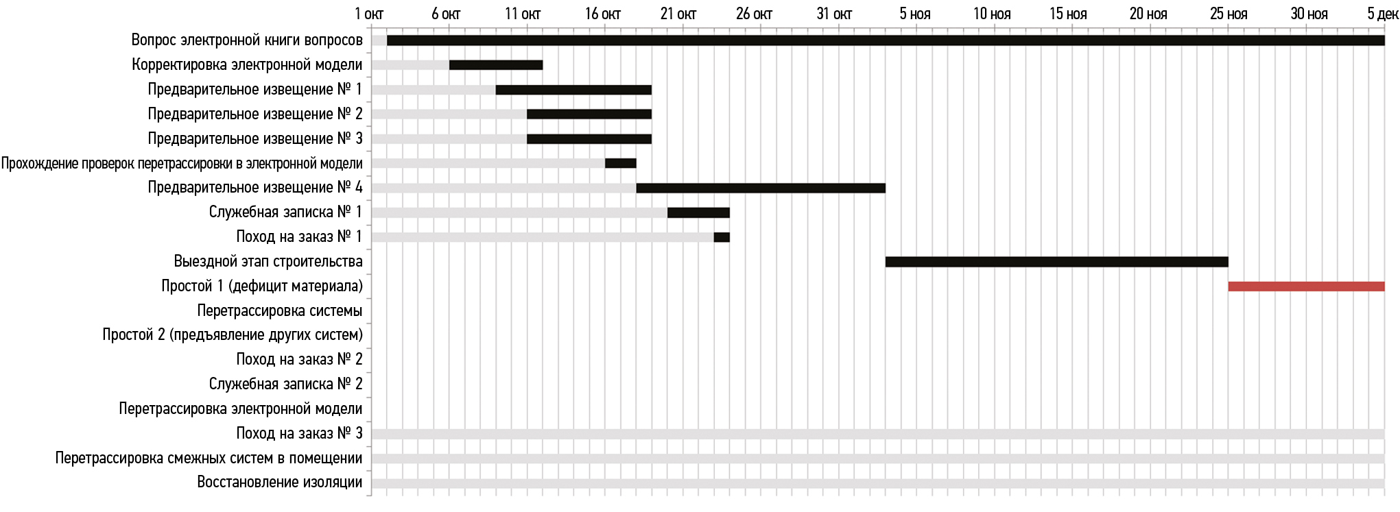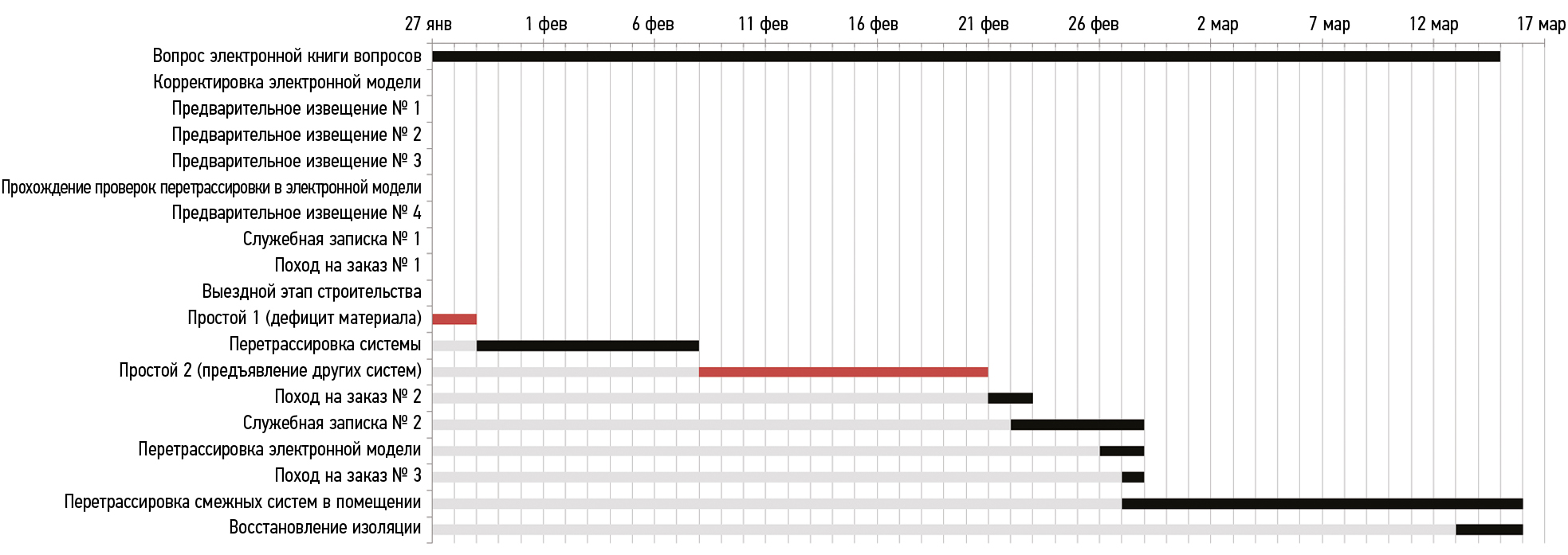 28.02 (ср.) ― 13.03 (ср.) | Перетрассировка смежных систем в помещении (строителями принято решение «выполнить без корректировки рабочей конструкторской документации») |
