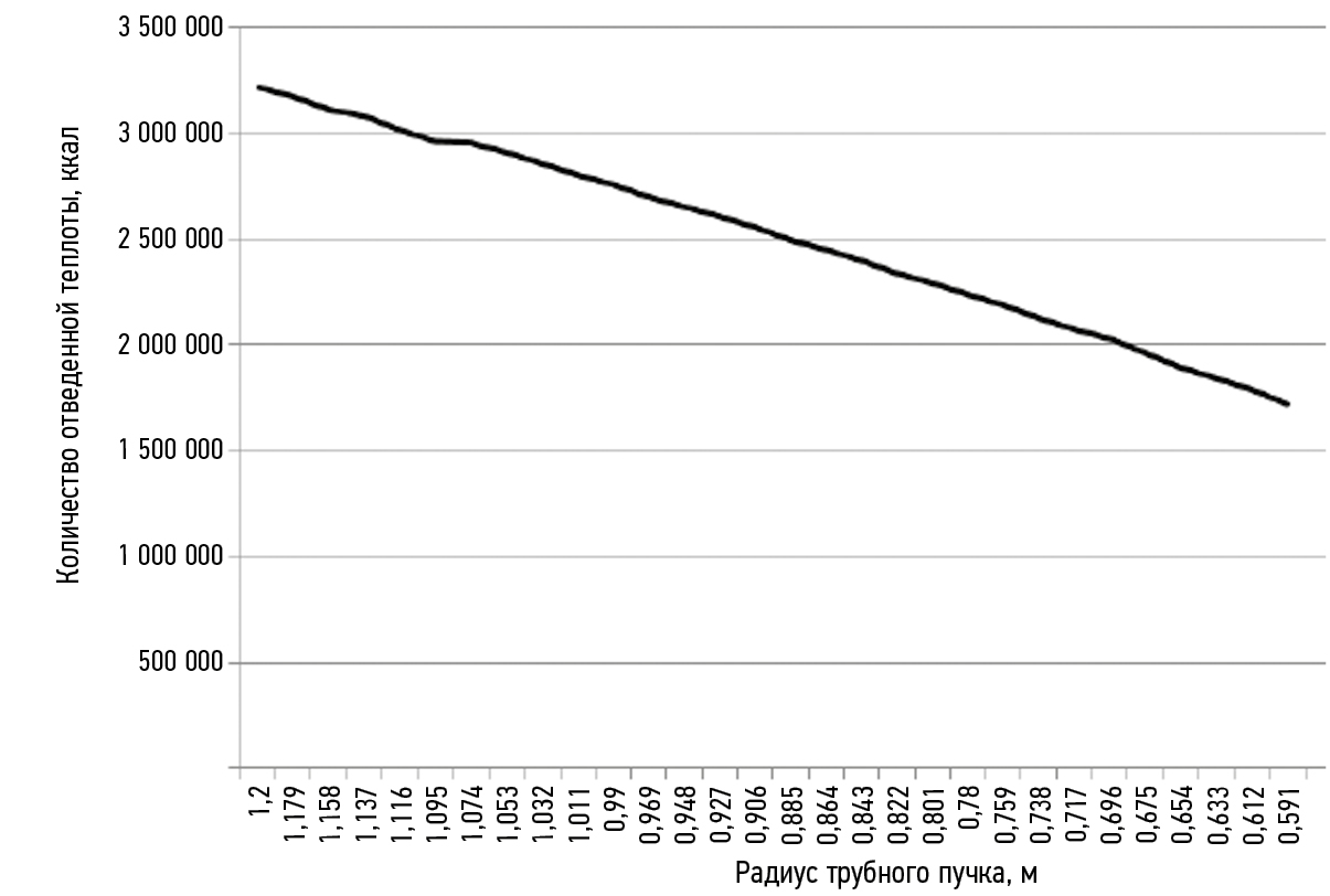 Рис. 8. Количество отведенной теплоты трубного пучка с винтовыми круглыми трубками, ккал.