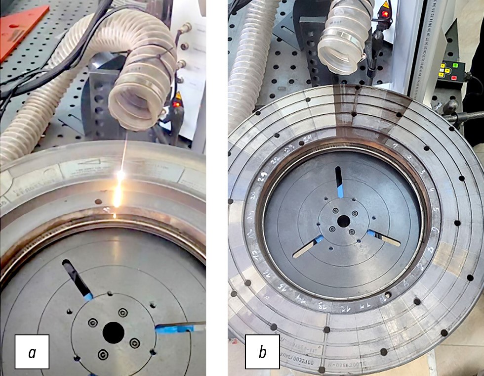 Fig. 2. Photos of a surface with a residual organic layer produced by heating the elastomer on a 40X steel mould with a diameter of 556 mm (used in tire production at Belshina JSC) during and after laser cleaning: a, view of the product during the laser cleaning experiment; b, clean surface after laser cleaning. The top view shows a conical sector of the product with the original organic substance (visible as the sharp gray boundary).
