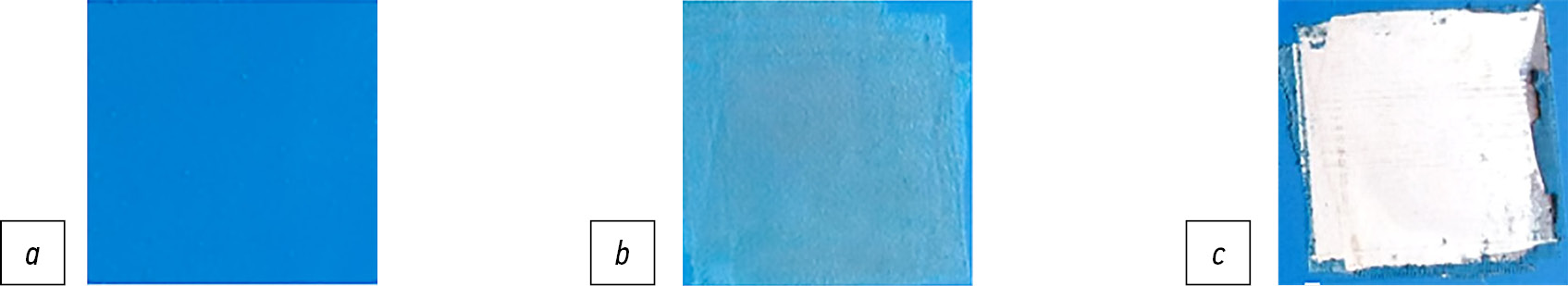 Fig. 3. Macroscopic morphology of sections (4 cm2 each) of an alkyd paint coating (average thickness: 120 μm) before and after laser cleaning with different parameters: а, paint coating surface before laser cleaning; b, partially cleaned surface after laser cleaning in regime 2 according to Table 2; c, completely cleaned part of the surface after laser cleaning in regime 4 according to Table 2.