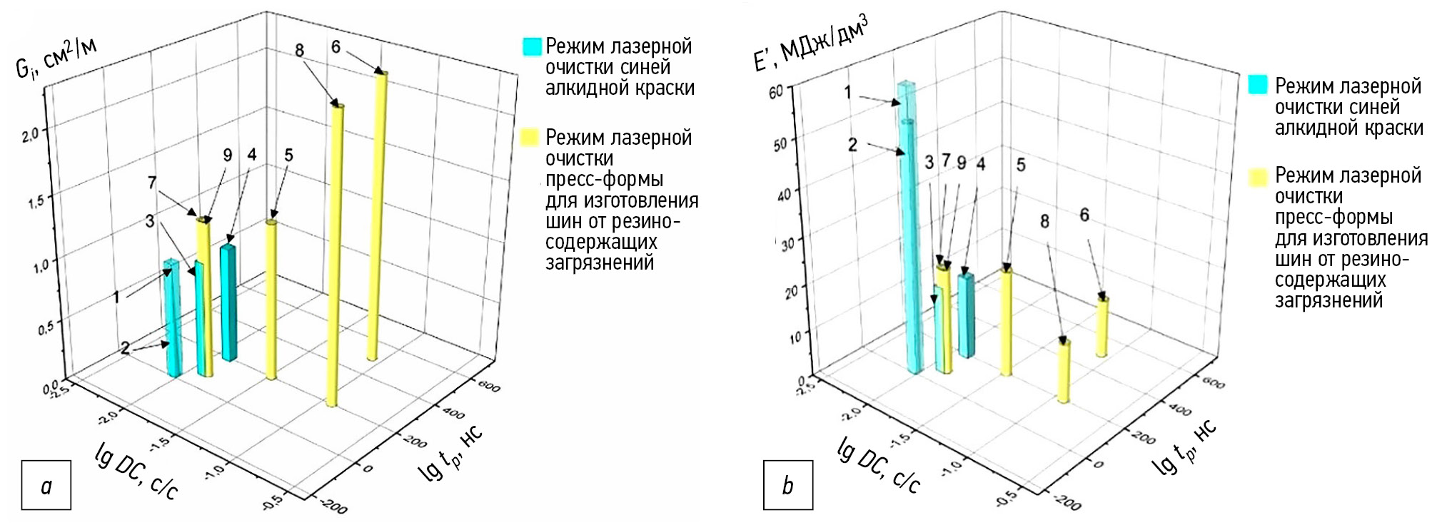 Рис. 6. Параметрические зависимости для наших экспериментов по лазерной очистке от алкидного лакокрасочного покрытия и от слоя резиносодержащих загрязнений: a — зависимость выходного параметра Gi (удельная производительность лазерной очистки) от двух входных параметров (коэффициент заполнения DC и длительность импульса лазерного излучения tp); b — зависимость выходного параметра E’ (энергозатраты на дм3 объема удаляемого слоя) от двух входных параметров (от коэффициента заполнения DC и от tp).