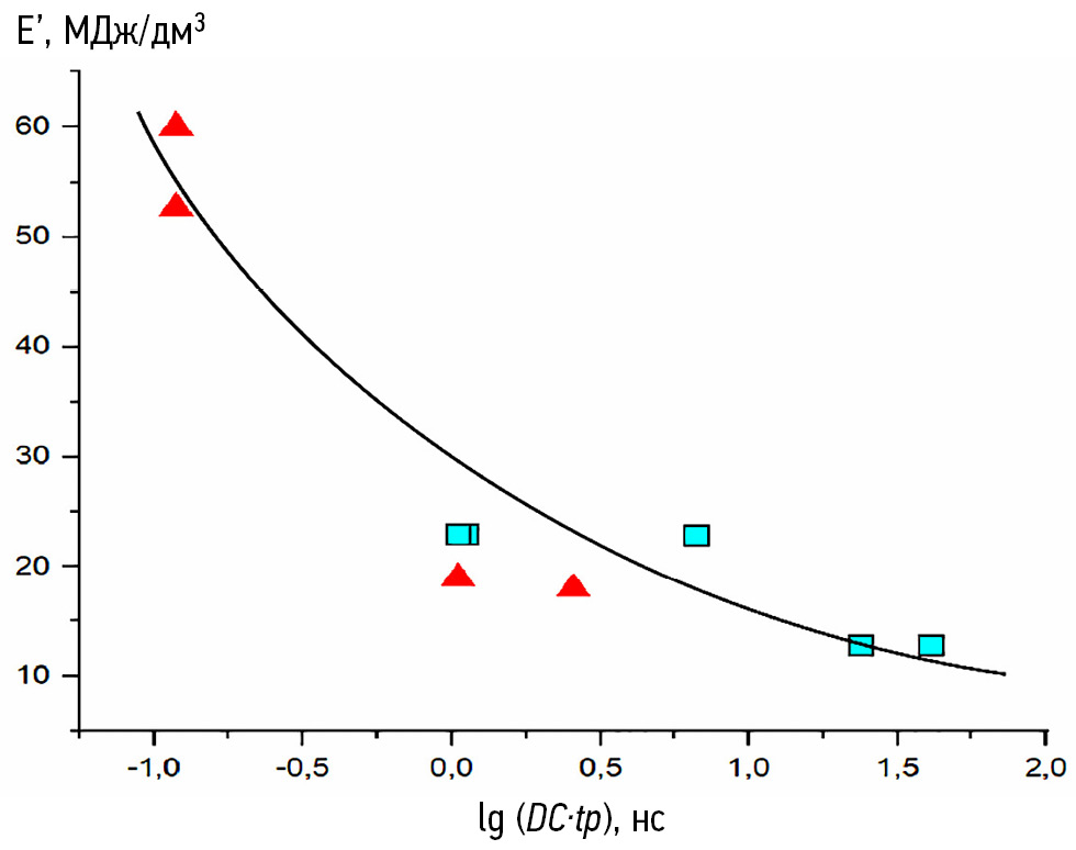 Анализ полученных нами в экспериментальной серии данных (в табл. 2) в сочетании с результатами аналогичных работ в данном направлении (с применением ОКГ с наносекундными импульсами — см. табл. 3 и рис. 5 и 6) показал наличие сложного многопараметрического характера связи между входными режимными параметрами и выходными характеристиками, а также то, что одними из наиболее явно (и прямо пропорционально) влияющих на интенсивность (т. е. обратные энергозатраты) процесса удаления органических слоев (различного состава) входных параметров являются коэффициент заполнения и длительность импульса излучения. Причем для случая небольшой группы режимов в нашей экспериментальной серии по ЛО зависимость для удельных энергозатрат (как показано на рис. 7) в однофакторном приближении может быть аппроксимирована в виде: ~ (const + (1 / lg (DC ∙ tp))), т.е. как обратно пропорциональная зависимость (параболического типа) параметра E’ от логарифма произведения DC ∙ tp = f ∙ tp2. При этом в оптимальных режимах по нашим данным эти энергозатраты на ЛО находятся на уровне 12,7 МДж на 1 дм3 вещества слоя (для случая режимов с удалением эластомерсодержащих загрязняющих веществ с поверхности из стали 40Х).