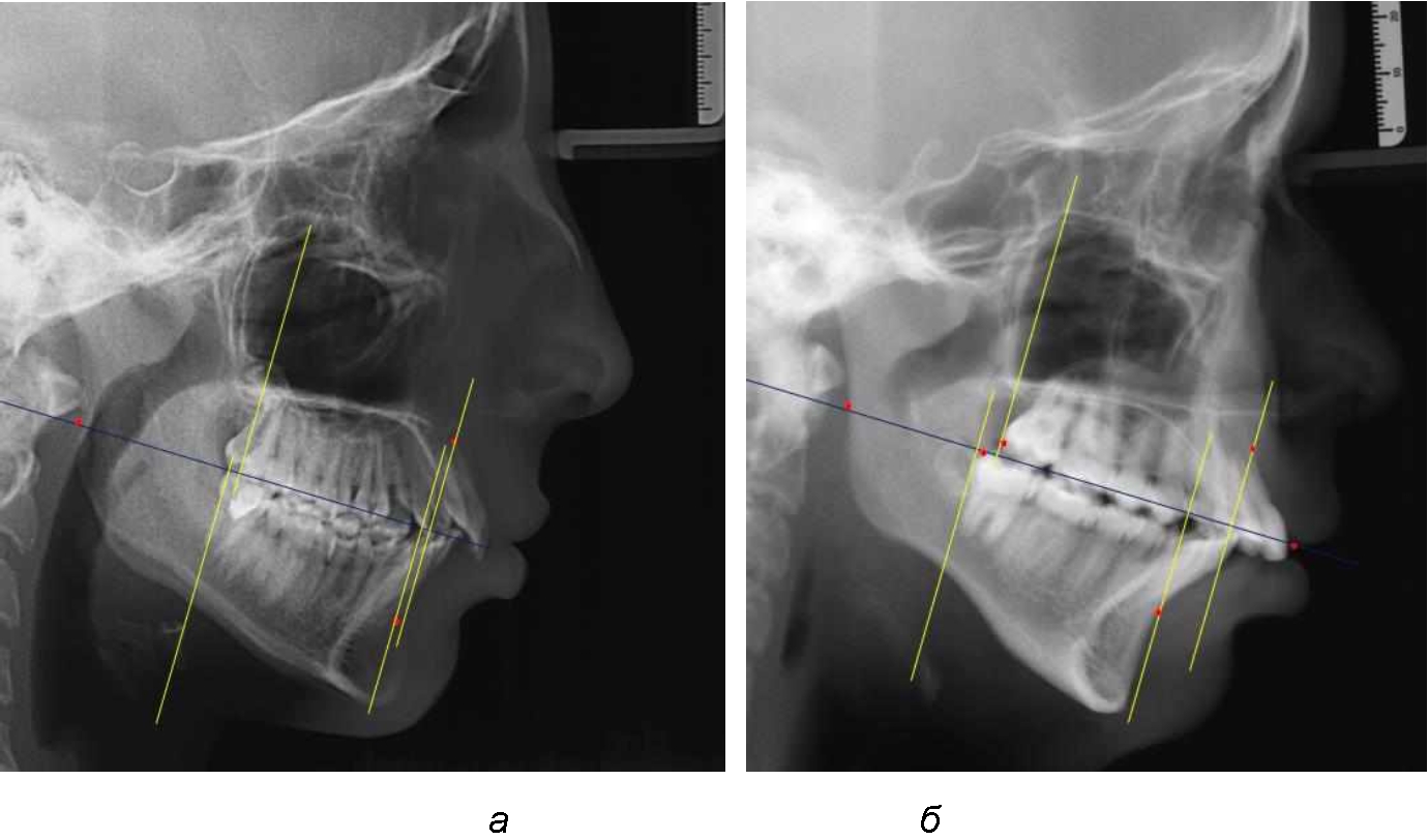 Телерентгенограммы с аномалиями окклюзии (2-я группа) разделили на 2-й подгруппы. В 1-й подгруппе были телерентгенограммы с характерными признаками мезиальной окклюзии, во 2-й подгруппе – с дистальной окклюзией.