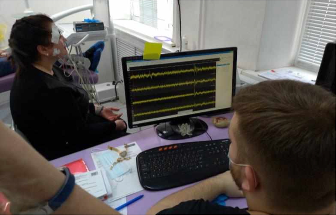 На кафедре стоматологии Института НМФО проведено обследование 59 пациентов в возрасте 22–25 лет. Проводимое исследование одобрено Локальным этическим комитетом (протокол № 14 от 19.11.2021 г.). Средний возраст составил – (22,9 ± 0,2) лет. Было проведено клиническое и электромиографическое обследование. В дополнении к основным методам обследования были выполнены пальпация жевательной мускулатуры в соответствии с балльной градацией от 0 до 3 баллов, определение степени открывания полости рта и электромиографическое обследование с помощью аппарата Synapsys (рис. 2).
