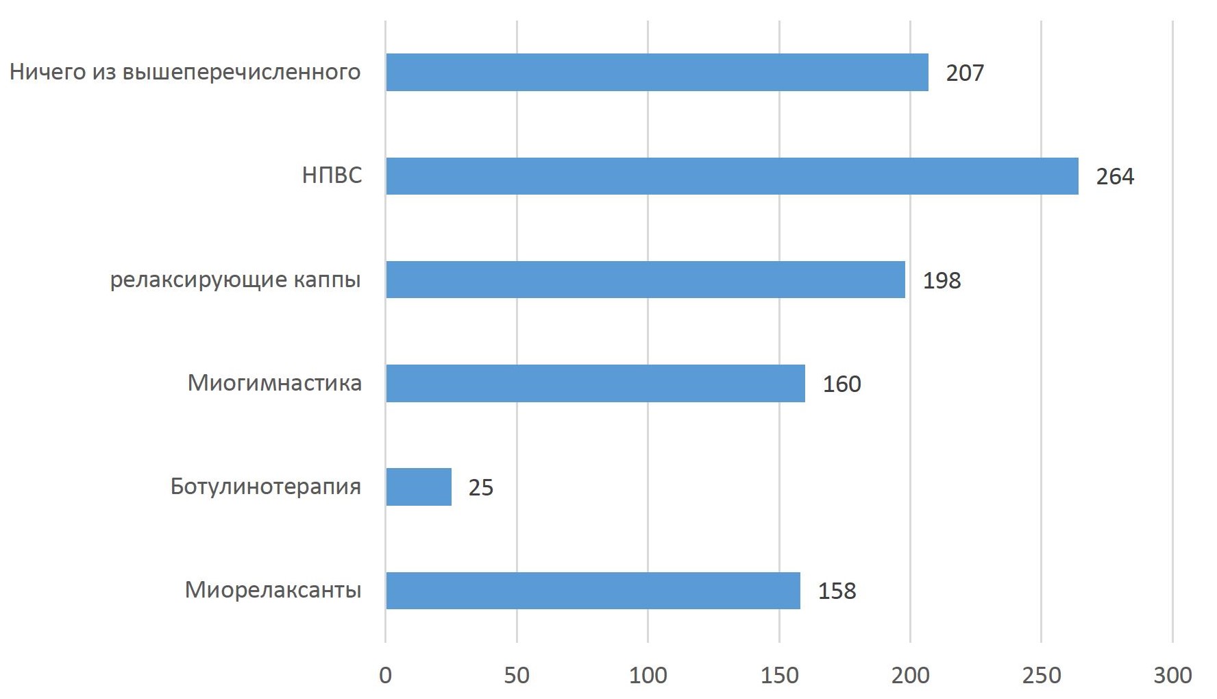 Таким образом, назначение нестероидных противовоспалительных препаратов (НПВС) было указано как основной метод лечения СБД ВНЧС в 44,7 % случае, а 35,1 % респондентов не применяют ничего из вышеперечисленного. Назначение релаксирующих капп как метод лечения занимает 3 место по частоте встречаемости 33,6 % респондентов, ботулинотерапию и назначение миорелаксантов включает в схему лечения в 4,2 и 26,8 % соответственно. Поддерживающую терапию в рамках проведения миогимнастических упражнений проводят в 27,1 % случаях.