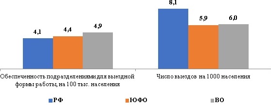 Диаграмма обеспеченности населения подразделениями для выездной формы работы на 100 тыс. населения, число выездов на 1 тыс. населения в Российской Федерации (РФ), Южном федеральном округе (ЮФО) и в Волгоградской области в 2022 г. представлена на рис. 1.