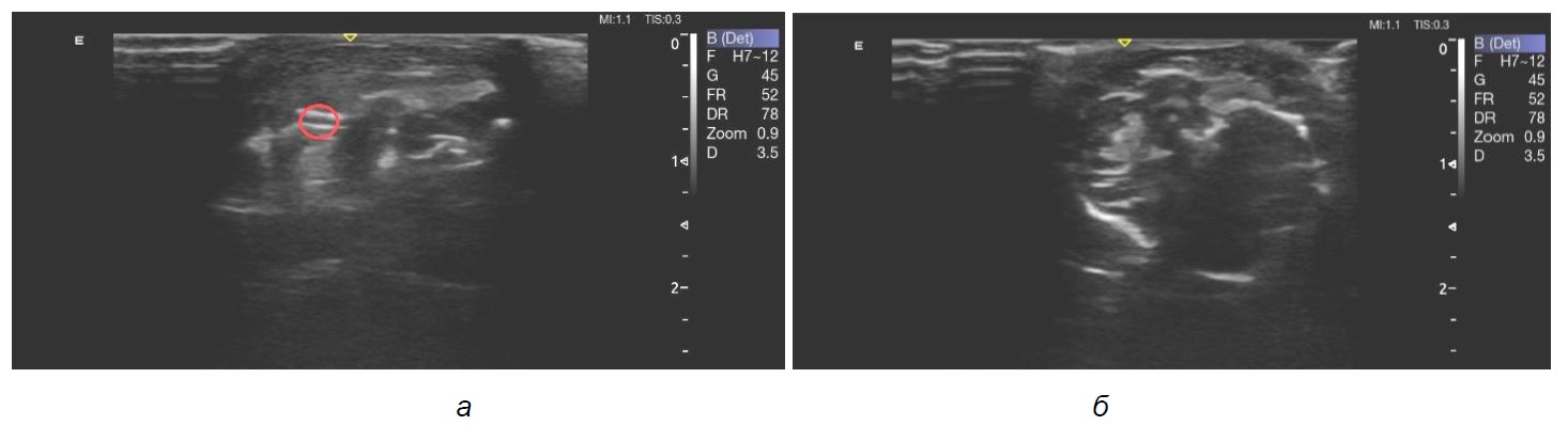 Рис. 7. Жевательная мышца справа – неоднородность в области инфильтрата (а); усиление эхогенности структуры жевательной мышцы слева, восстановление тонуса (б)
