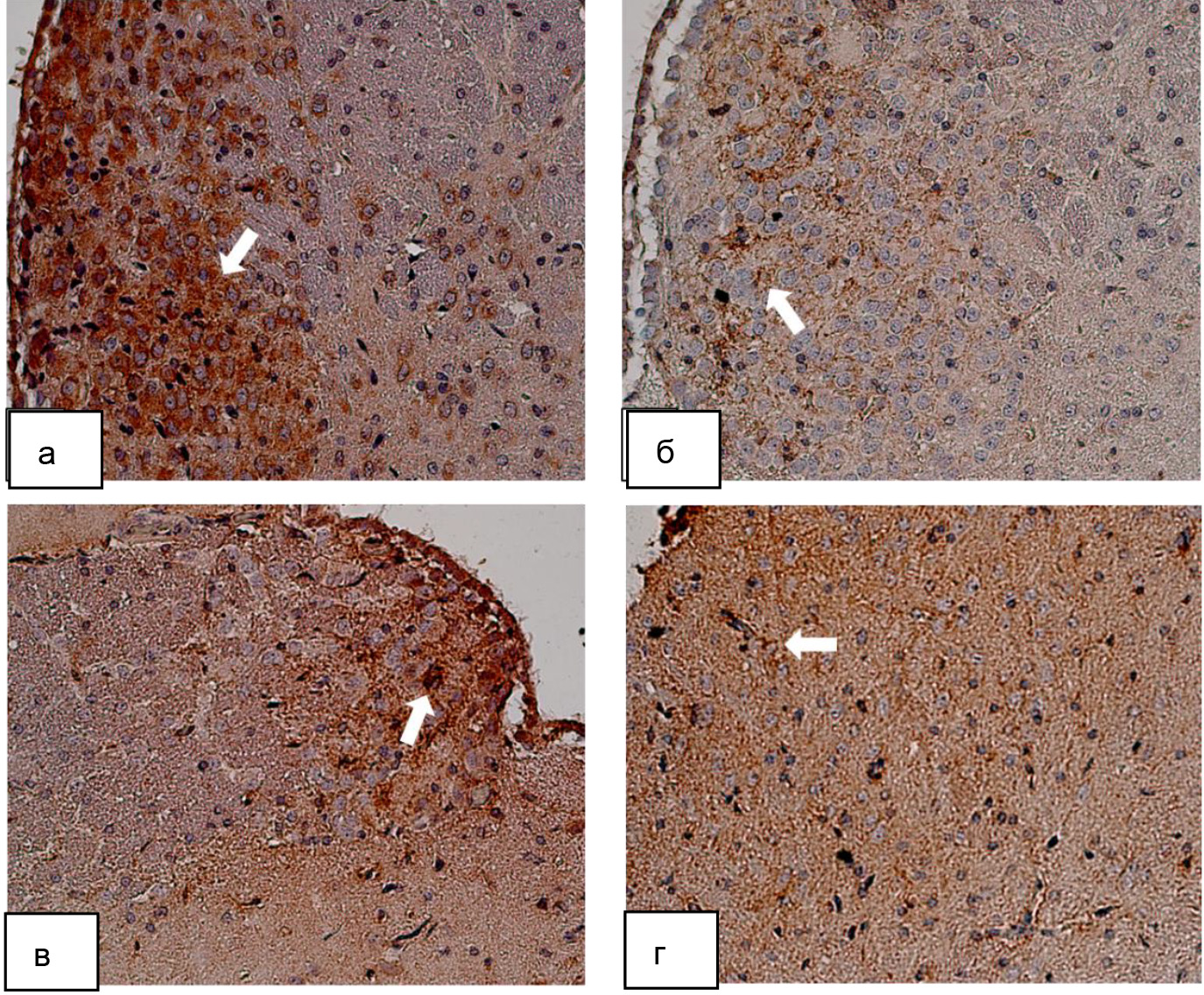 Рис. 2. Изменение экспрессии белка Klotho в цитоплазме нейронов гипоталамуса крыс при экспериментальном сахарном диабете: а – группа интактных животных (крысы без СД); б – группа животных с сахарным диабетом (СД); в – группа животных с сахарным диабетом и фармакокоррекцией аминалоном (СД + аминалон); г – группа животных с сахарным диабетом и фармакокоррекцией сукцикардом (СД + сукцикард). Иммуногистохимическое исследование, антитела против белка Klotho, докраска гематоксилином. Увеличение ×400. Белые стрелки – экспрессия ИРМ