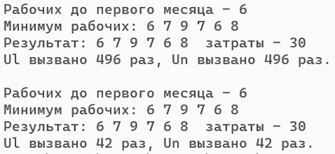 Для сравнения построен алгоритм, который перебирает все возможные последовательности численности рабочих в каждом месяце по порядку и находит среди них ту, при которой суммарные затраты будут минимальными.