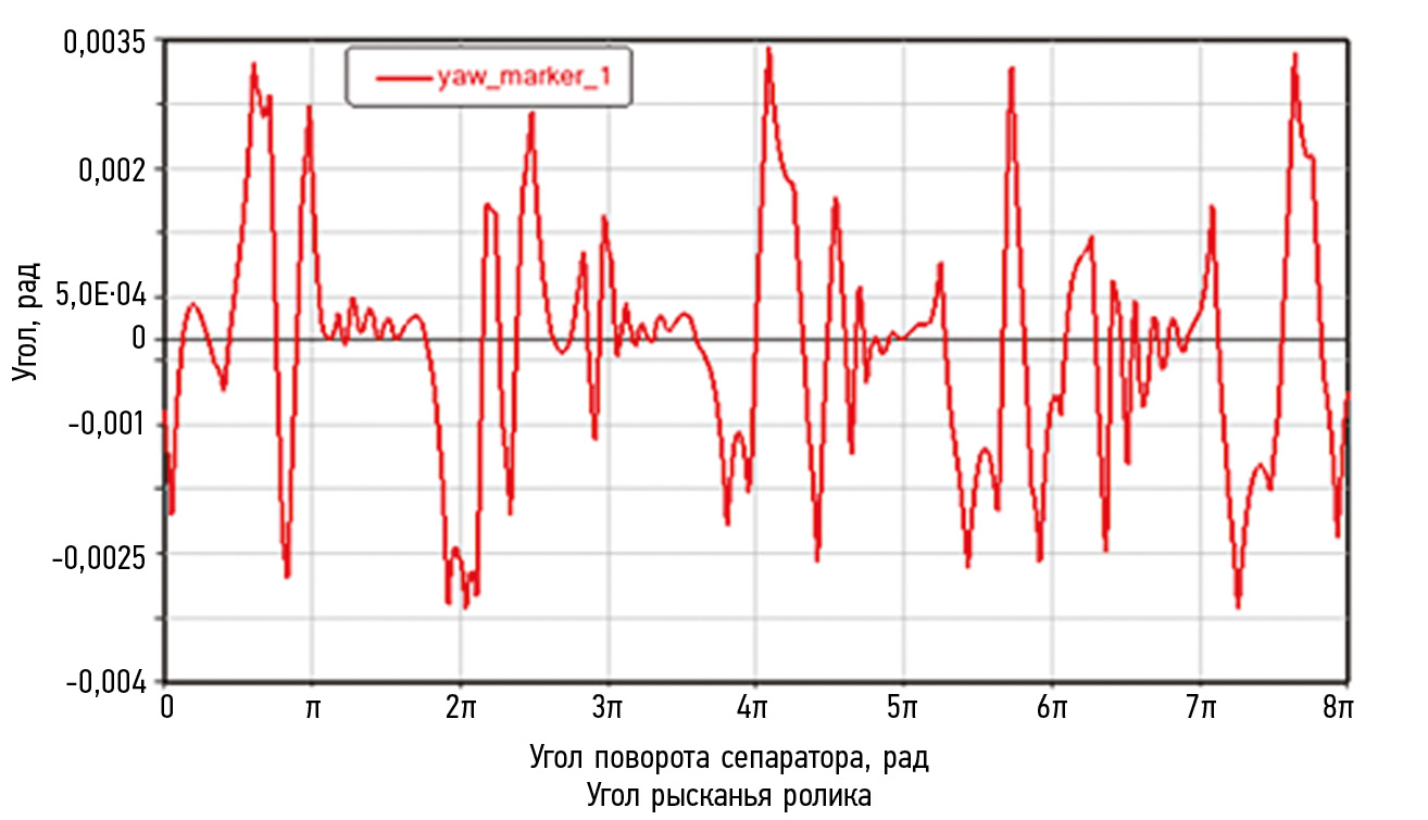 Результаты. При моделировании определяются все необходимые для расчета износа кинематические и динамические характеристики подшипника: силы, скорости, коэффициенты трения, траектории, взаимное расположение контактирующих деталей. На рис. 1 в качестве примера для цилиндрического роликоподшипника с диаметрами ролика 11 мм и внутренней дорожки качения 181,5 мм приводится изменение угла рысканья ролика — его несоосности с внутренним кольцом в касательной плоскости дорожки качения за четыре последовательных оборота сепаратора. Большие перекосы возникают в ненагруженной зоне.