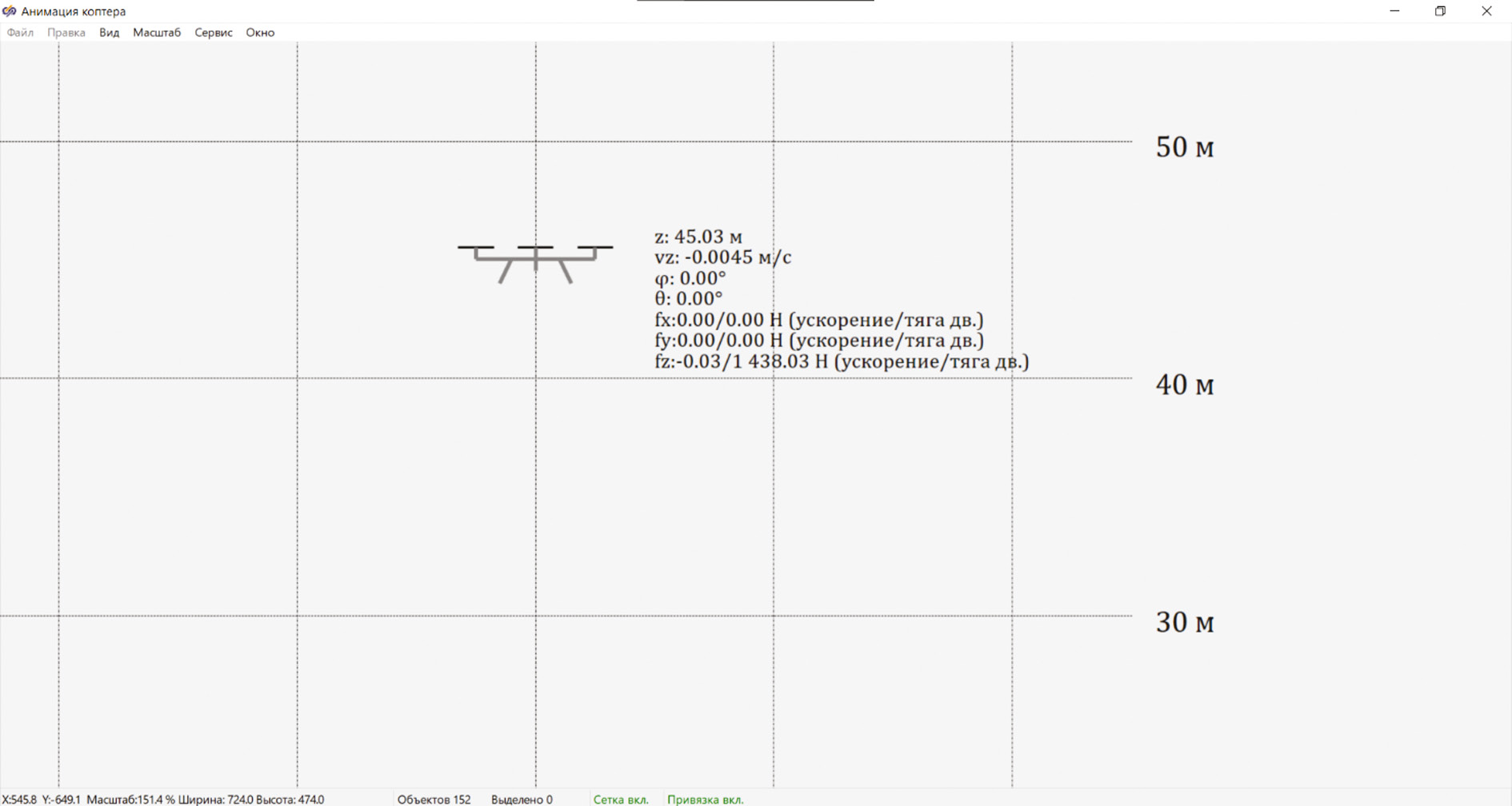 Видно, что микро-БПЛА движется в системе координат z, а именно опускается с определенной скоростью, то есть происходит его посадка.