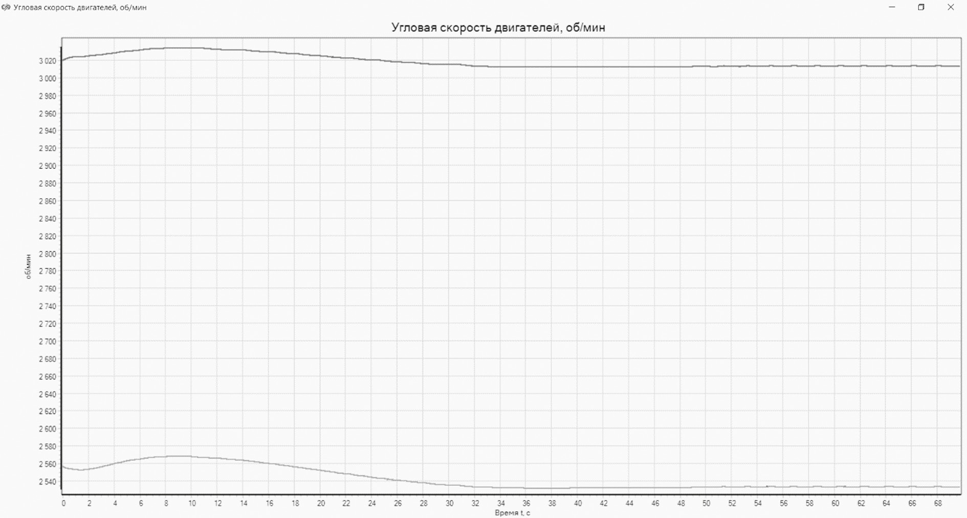 Рис. 2. Зависимость угловой скорости двигателей от пройденного времени