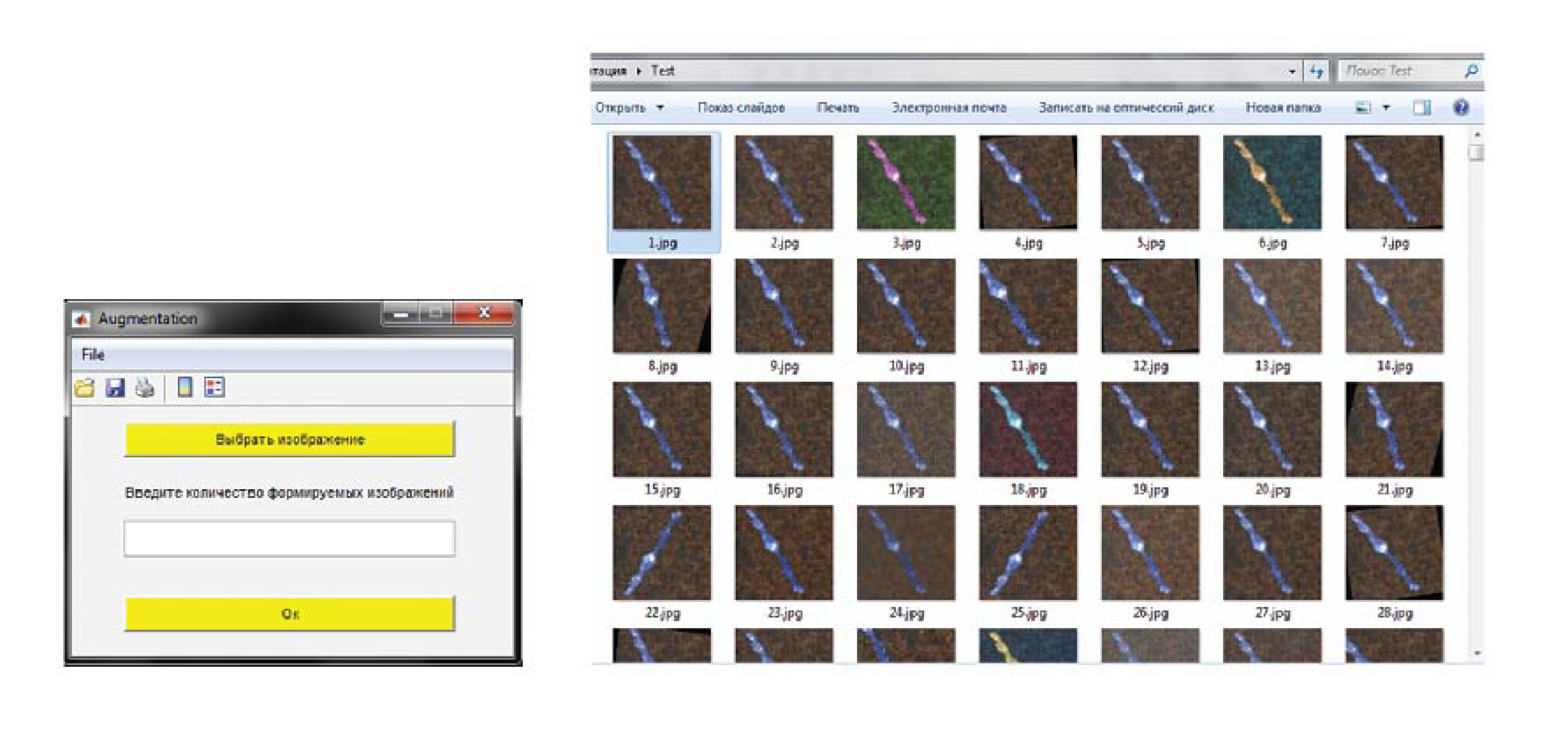 Выводы. Разработанная программа предназначена для выполнения процесса аугментации, что позволяет упростить процедуру сбора изображений для создания обучающего набора данных. Кроме того, этот процесс происходит в автоматизированном режиме, что приводит к значительному сокращению временных затрат на проведение процедуры формирования изображений.