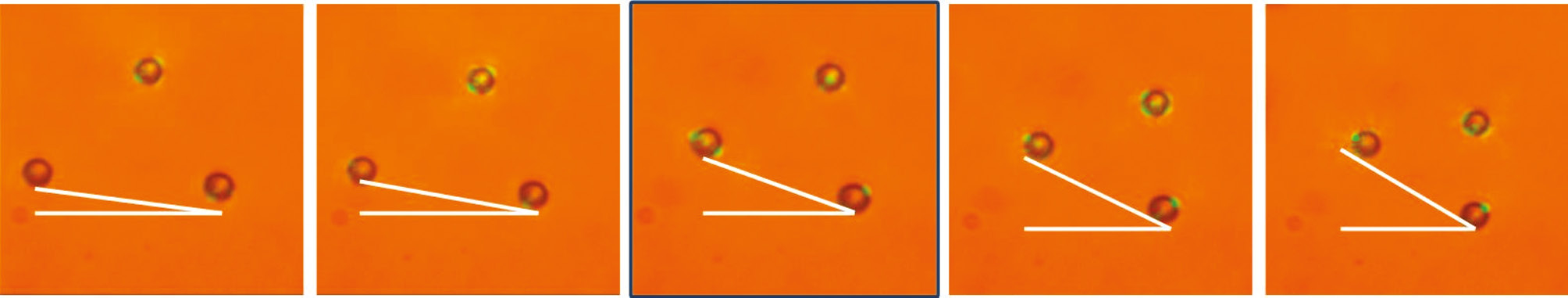 Рис. 3. Кадры из эксперимента по оптическому повороту латексных микросфер при дефокусировке лазерного пучка в форме вершин Кассиопеи