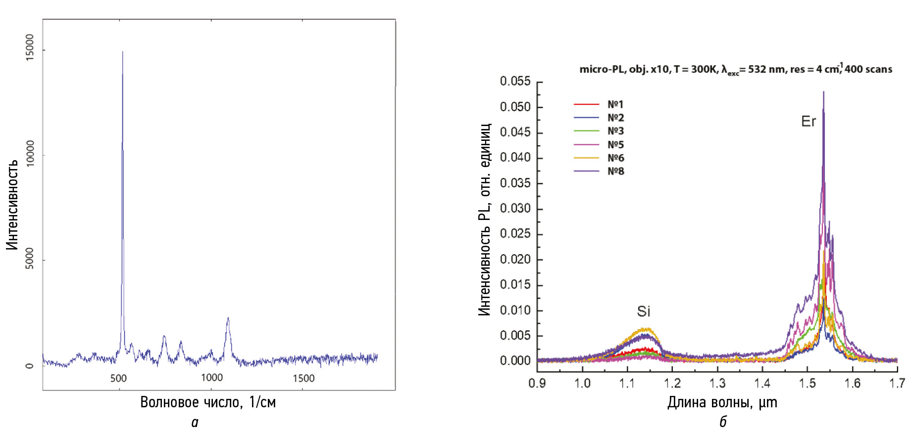 Рис. 1. Спектры комбинационного рассеяния света образцов ПК легированным эрбием и иттербием (а), спектры микро-фотолюминисценции (б)