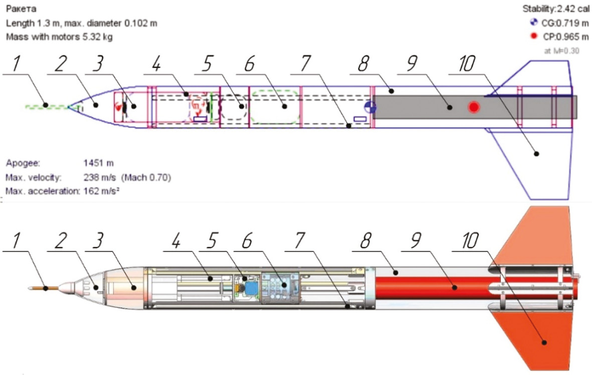 Рис. 1. Компоновочная схема ЭМР «Pepelats»: 1 — приемник воздушного давления (ПВД); 2 — головной обтекатель (ГО) оживальной формы; 3 — полезная нагрузка (ПН) форм-фактора PocketQube; 4 — транспортно-пусковой контейнер (ТПК); 5 — система выброса полезной нагрузки (СВПН); 6 — блок бортовой электроники (БЭ); 7 — силовой набор ракеты, состоящий из стрингеров и шпангоутов; 8 — корпусная труба ЭМР; 9 — ТТРД; 10 — хвостовое оперение (ХО) — стабилизаторы