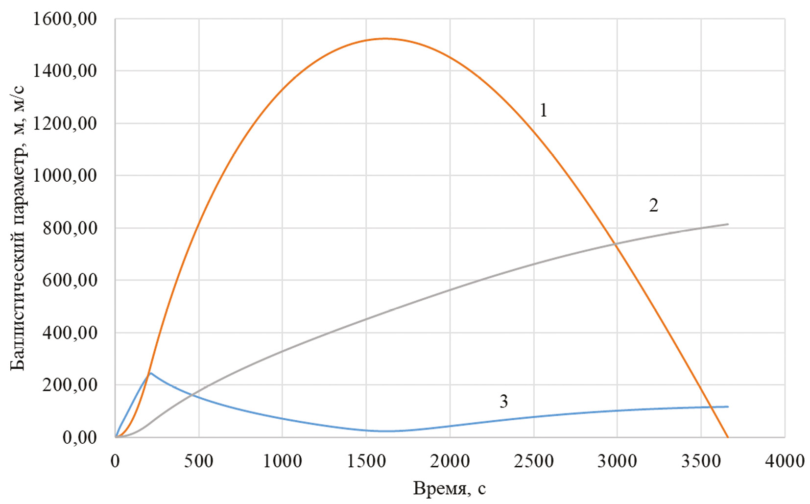 Рис. 2. Результат моделирования: 1 — зависимость высоты от времени; 2 — дальность полета; 3 — зависимость скорости от времени