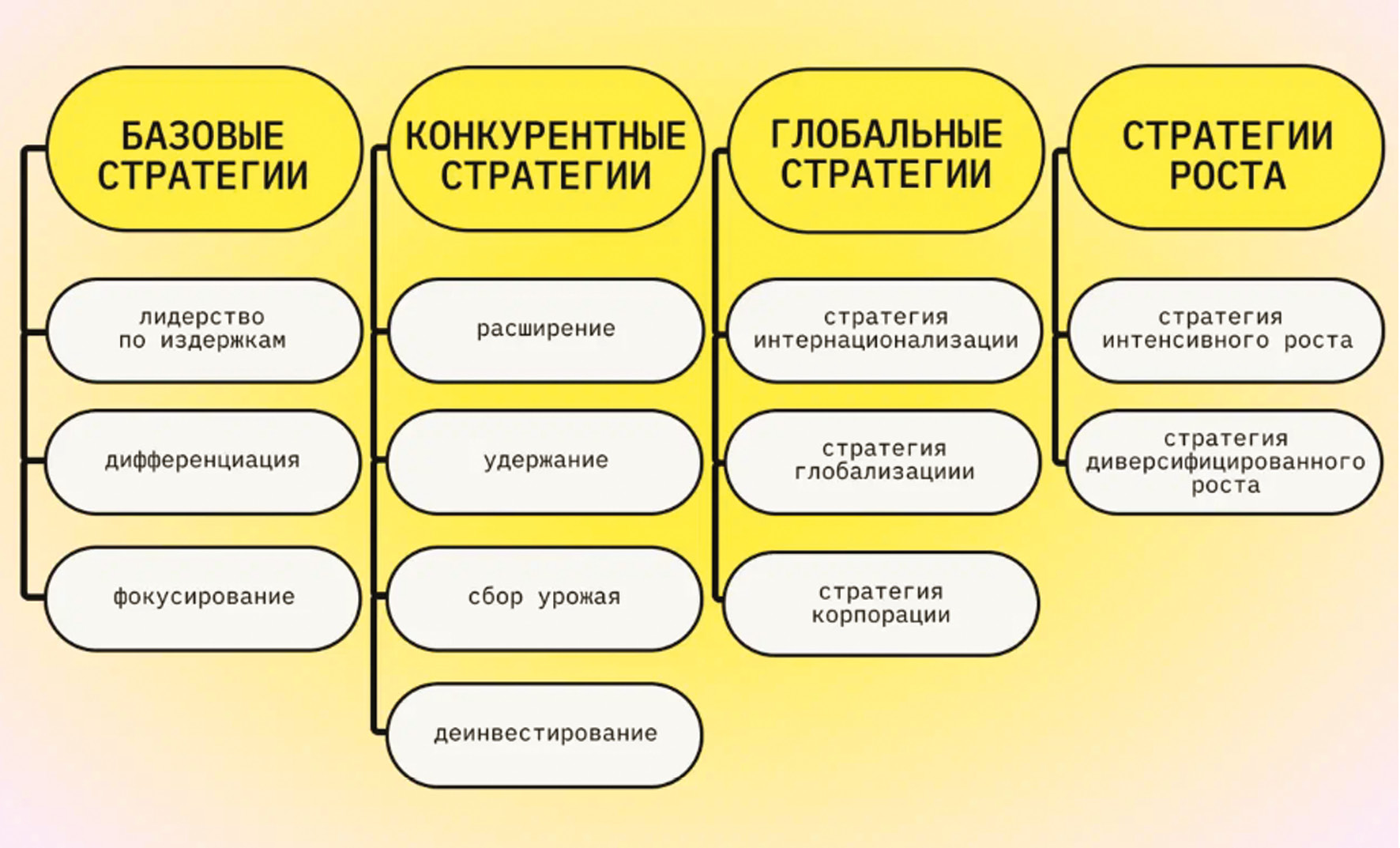 Базовые стратегии включают в себя лидерство по издержкам, дифференциацию, фокусирование [2].
