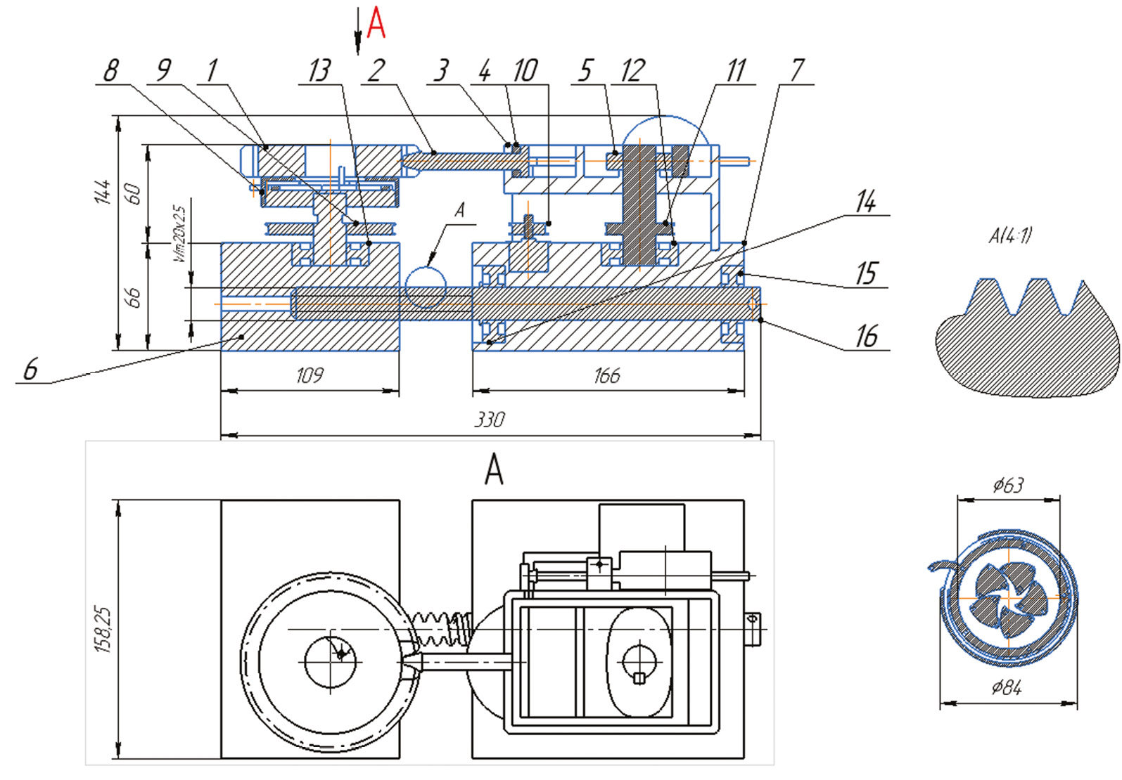 Рис. 1. Сборочный чертеж биениемера: 1 — колесо зубчатое; 2 — шток; 3 — корпус; 4 — тяга; 5 — кулачок; 6 — станина 1; 7 — станина 2; 8 — зажимной механизм; 9 — шкив колеса; 10 — шкив промежуточный; 11 — вал-шкив; 12 — подшипник осевой № 1; 13 — подшипник осевой № 2; 14 — подшипник радиальный № 1; 15 — подшипник радиальный № 2; 16 — вал с ходовой резьбой