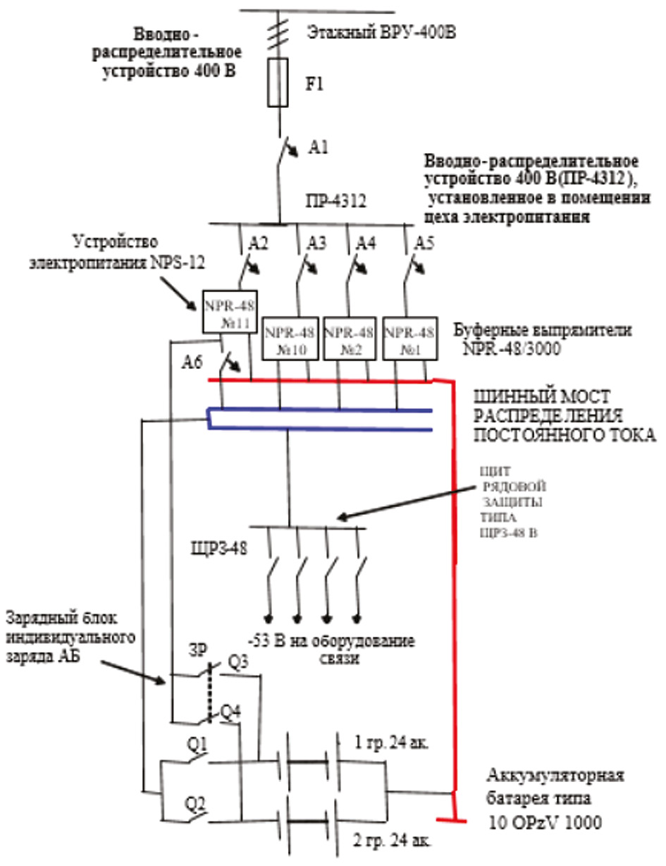 На рис. 2 показана схема установки. Электропитание установки осуществляется от вводно-распределительного устройства ВРУ 48В. Трехфазное напряжение сети 400/230 В проходит через предохранитель F1 на 250 А и автоматический выключатель А1 кабелем ВВГ подается в помещение цеха электропитания.