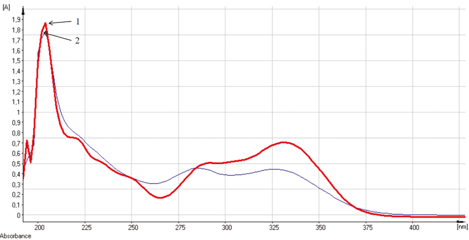 Рис. 1. Электронный спектр густого экстракта на 40 % этиловом спирте: 1 — спиртовой раствор стандартного образца розмариновой кислоты; 2 — густой экстракт на 40 % этиловом спирте