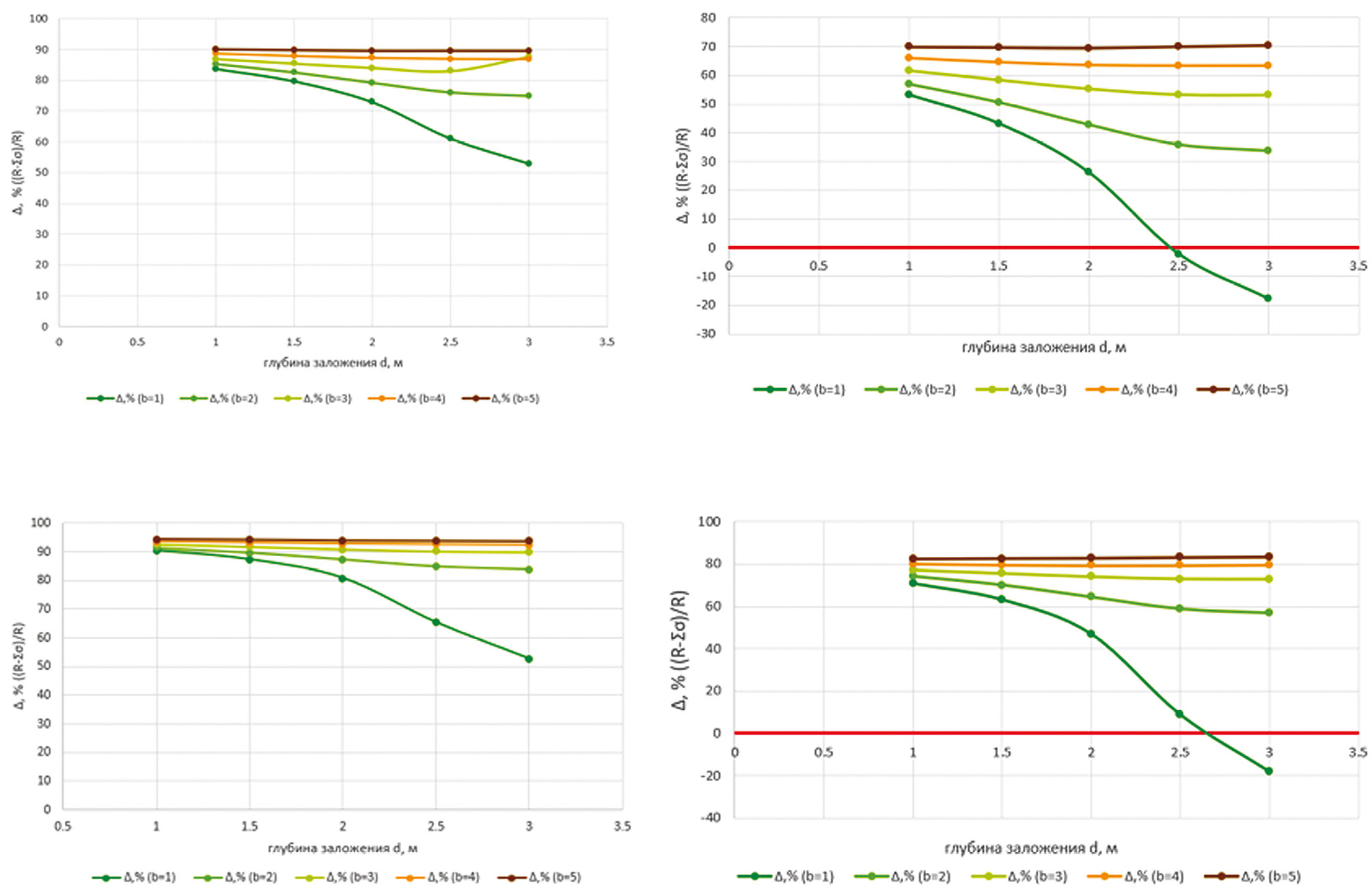 Рис. 1. Сравнение результатов варьирования ширины подошвы фундамента b при величине внешней нагрузки N = 300 кН и мощности несущего слоя h = 3 м: а) сочетание «глина–песок» — ленточный фундамент; б) сочетание «глина–песок» — отдельно стоящий фундамент; в) сочетание «суглинок–супесь» — ленточный фундамент; г) сочетание «суглинок–супесь» — отдельно стоящий фундамент