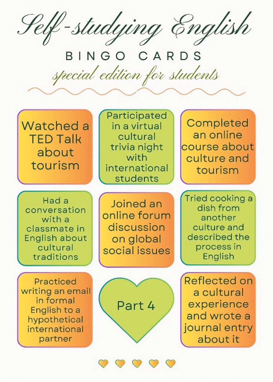 One bingo card specifically includes activities that can be entertaining for a student of Social Culture department (Figure 2) such as “Watched a TED Talk about tourism”, “Joined an online forum discussion”, “Practised writing an email in formal English to a hypothetical international partner”, so that students can focus on the aspects of the language that are most relevant to their academic and professional goals.
