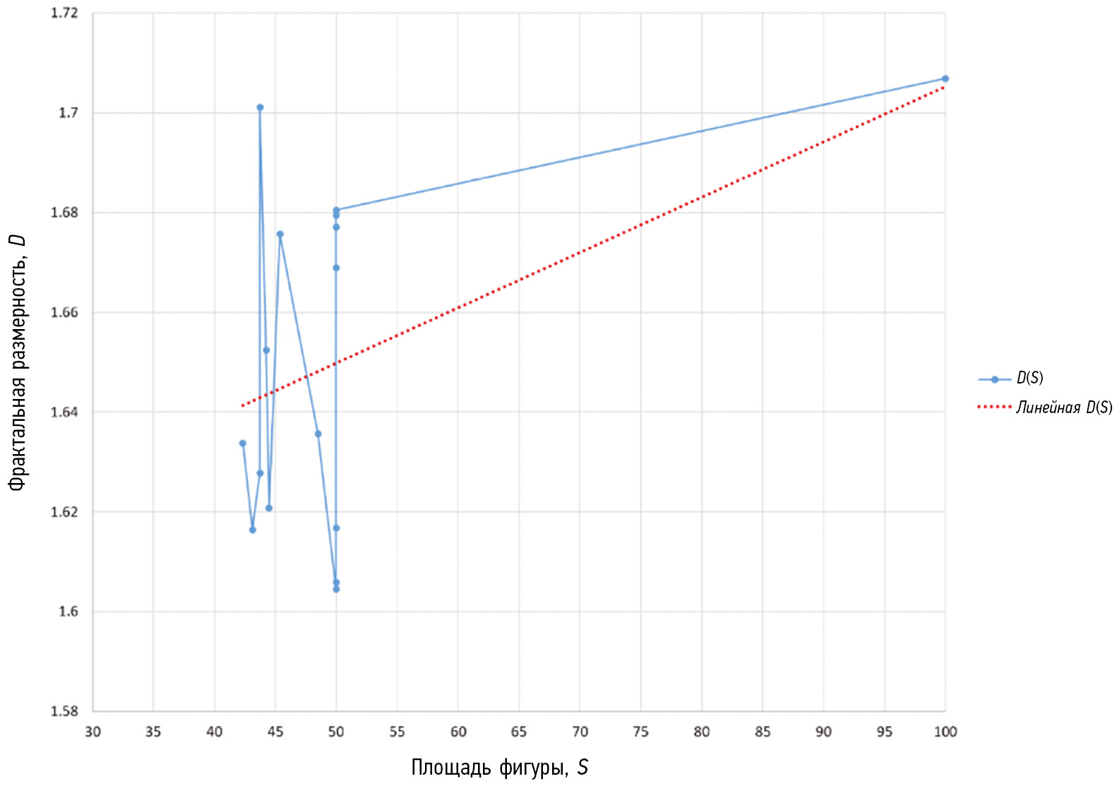 Рис. 3. Зависимость фрактальной размерности от площади фигуры