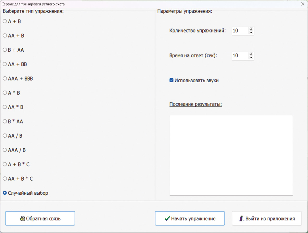 Результаты. Сервис включает в себя две формы — форму настройки (рис. 1) и форму для выполнения цикла упражнений на примере решения арифметических выражений (рис. 2).