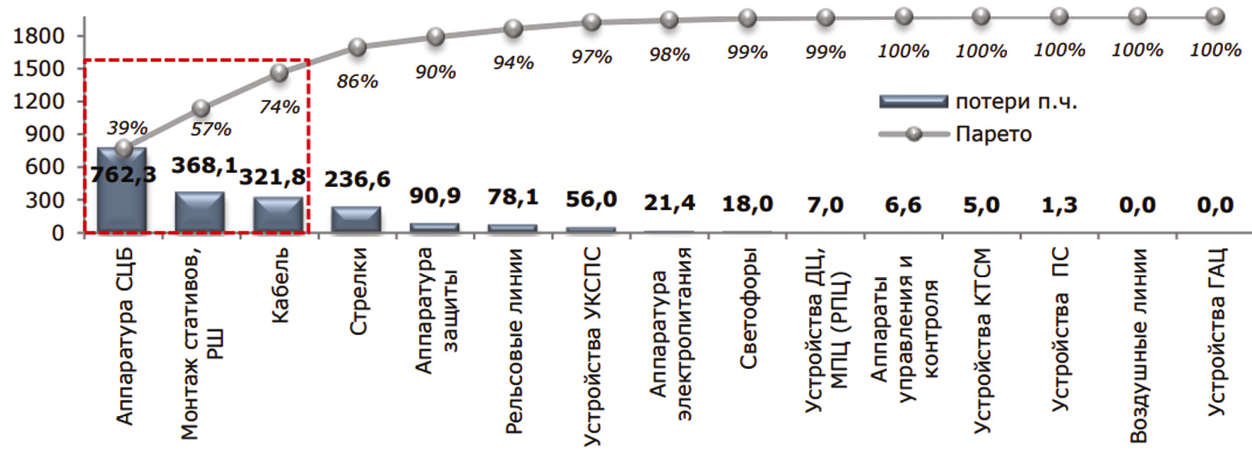 Рис. 2. Распределение Парето потерь поездо-часов от отказов вида «эксплуатационный»