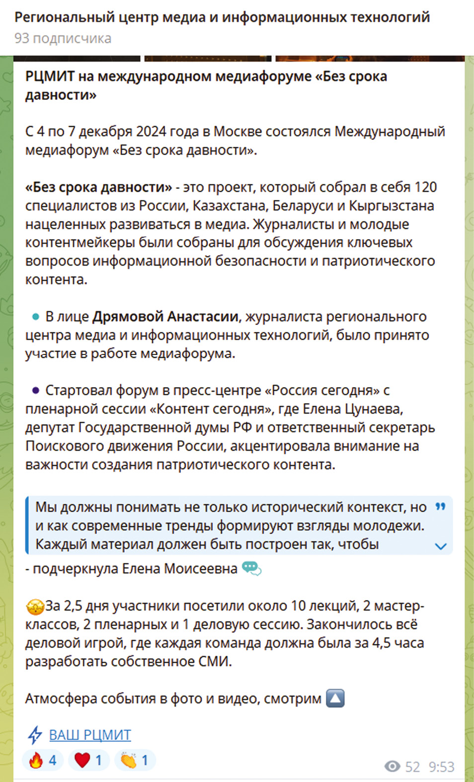 Результаты. Анализ показал, что нерегулярность публикаций и ограниченное использование мультимедийных форматов снижают интерес аудитории. Внедрение регулярного графика (10 публикаций в неделю), акцент на визуальном и персонализированном контенте, а также активное взаимодействие с подписчиками позволили увеличить охват на 30 %, а уровень вовлеченности — на 50 %. Кросс-продвижение между платформами обеспечило дополнительный прирост подписчиков. Наибольший отклик вызвали публикации, связанные с личными историями (рис. 1) и региональными событиями (рис. 2).