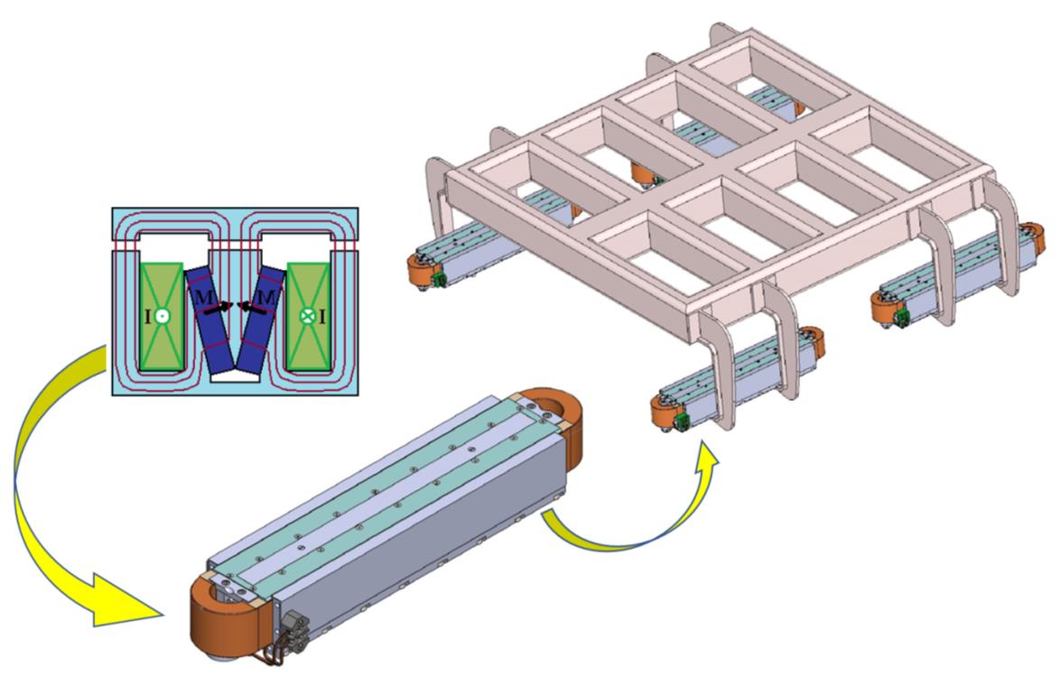 В подвесе используются ГЭМ; в состав ГЭМ входят: стальной магнитопровод, токовая катушка и постоянные Nd-Fe-B магниты; слева показано сечение ГЭМ, в котором буквой М помечены постоянные магниты, буквой I обозначена токовая катушка, выделены стальной магнитопровод ГЭМ и над ним стальная направляющая, закрепляемая на путевой структуре, показаны линии магнитного поля в магнитопроводе и воздушном левитационном зазоре