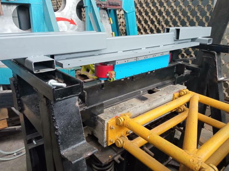 Стендовая установка И142 предназначена для измерения подъемных сил электромагнитов. Гибридный электромагнит был установлен на горизонтальную балку измерительной установки, см. Рис. 2. Стальная плита, имитирующая путевую структуру, устанавливалась над рабочей поверхностью полюсов ГЭМ с помощью прокладок, толщина которых подбиралась таким образом, чтобы обеспечить необходимые величины зазора между полюсами ГЭМ и плитой.