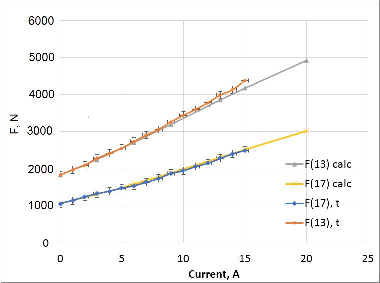 На Рис. 3 приведены результаты сопоставления измеренных и рассчитанных электромагнитных сил.