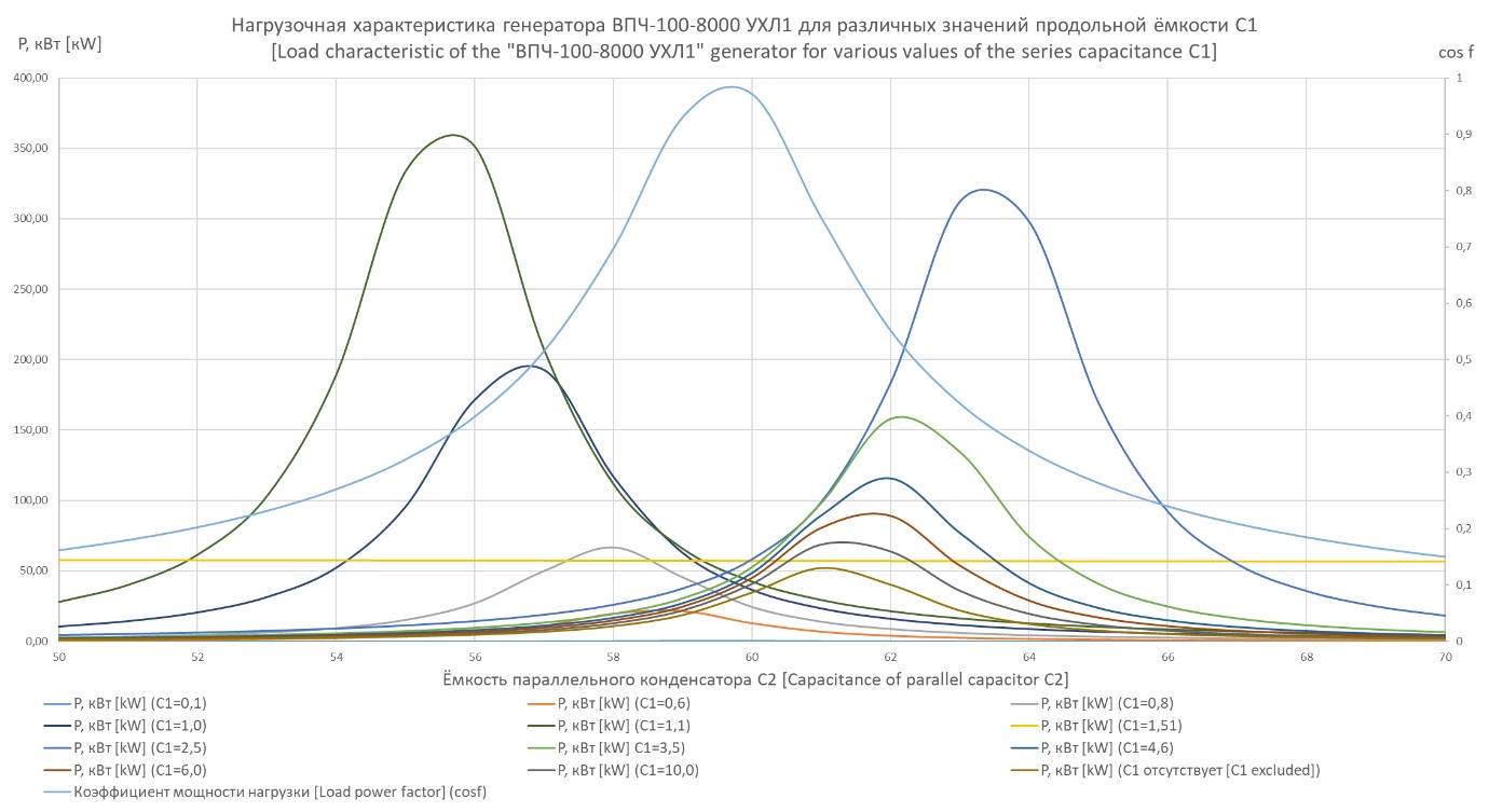 Например, в рамках описанного ранее эксперимента, на практике была достигнута настройка установки индукционного нагрева при использовании двух различных источников: генераторов повышенной частоты типа ВПЧ-100-8000УХЛ1 и ППЧВ-250-10,0-6000УХЛ4 с номинальной частотой 8 000 Гц и 10 000 Гц соответственно и номинальной мощностью 100 кВт и 250 кВт соответственно.