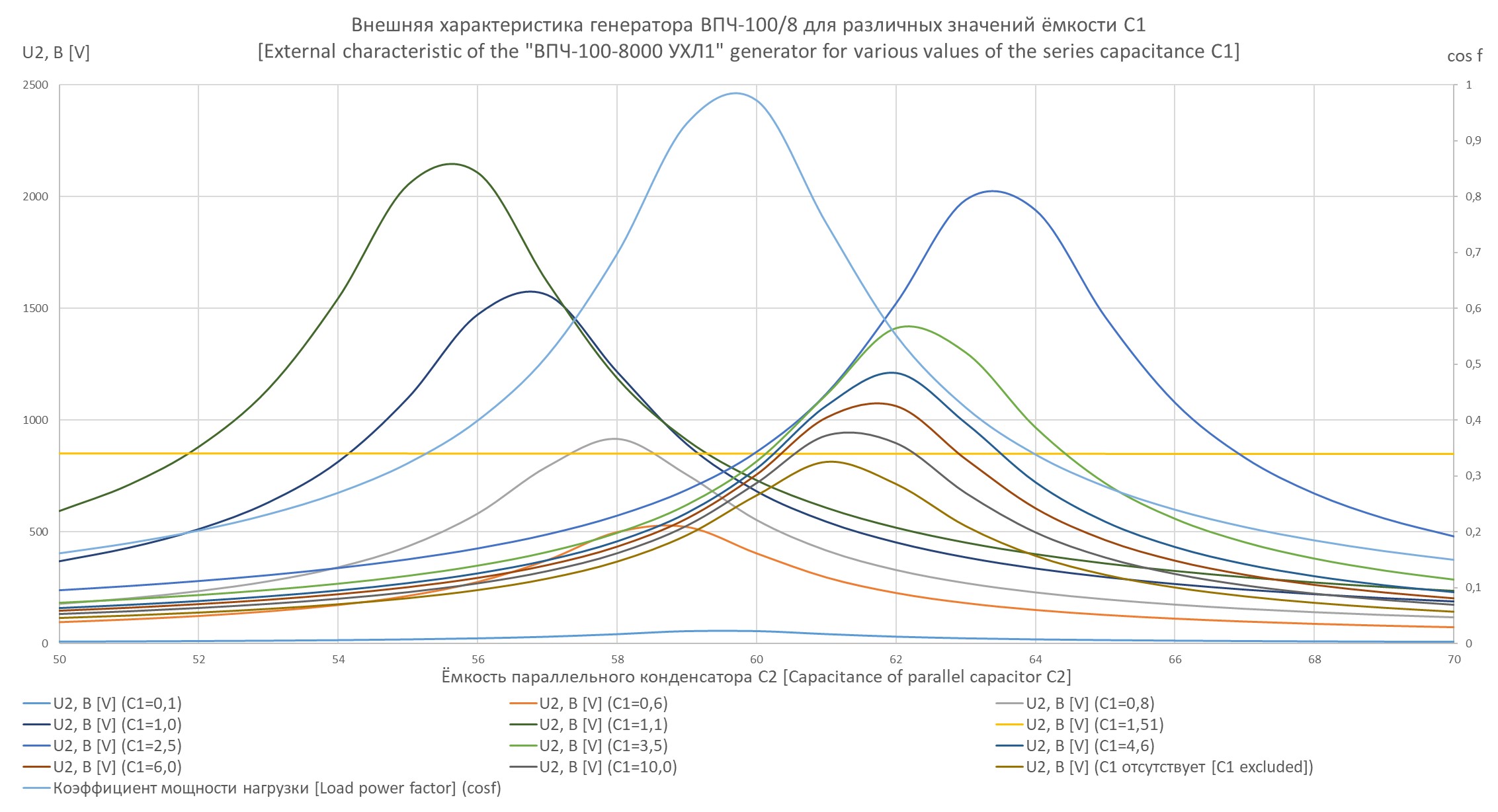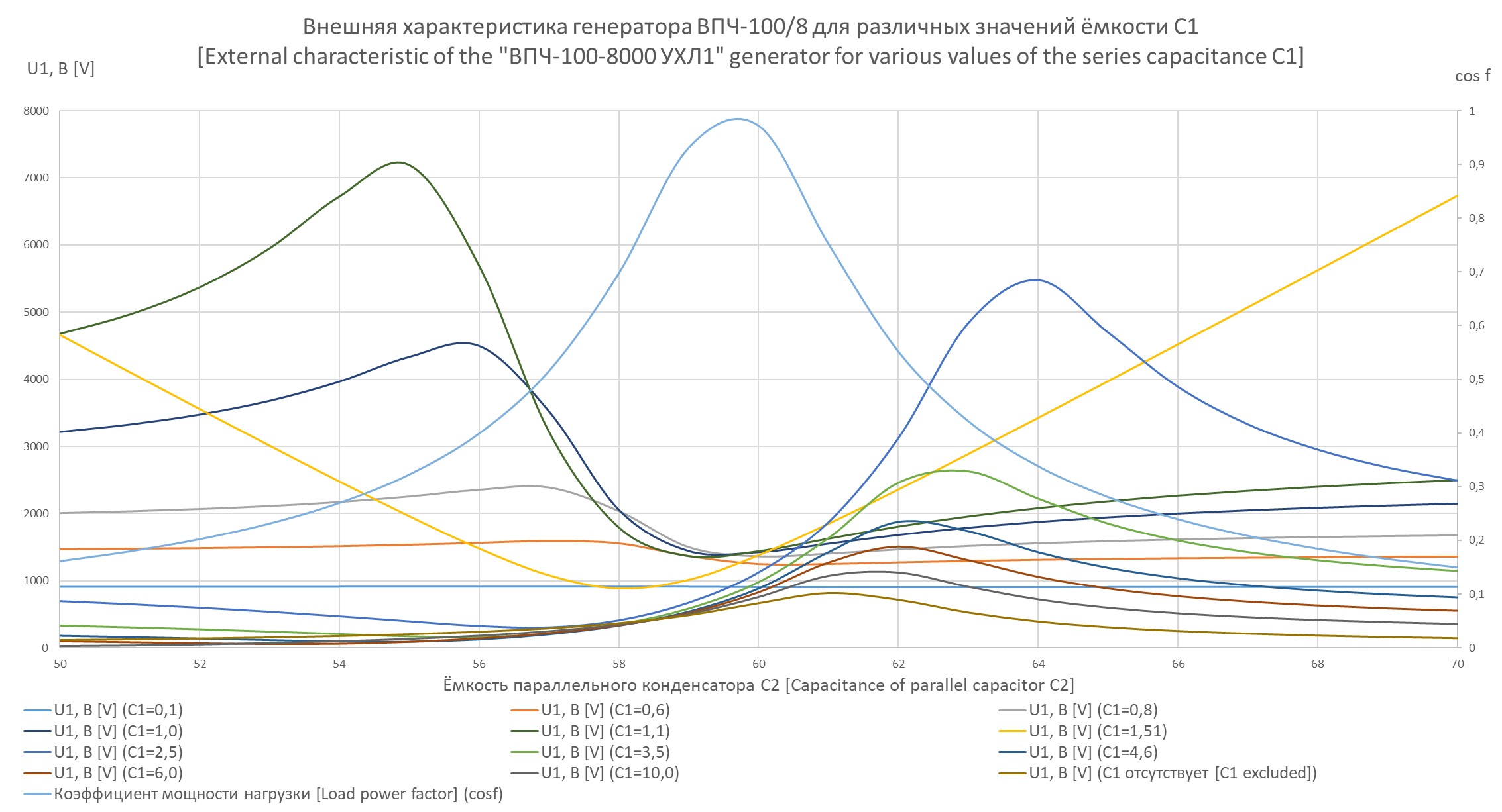 Как видно из Рис. 3, Рис. 4, при постоянном значении ЭДС напряжения на элементах цепи (Рис. 1) могут изменяться в широких пределах в зависимости от коэффициента мощности нагрузки, который, в свою очередь, регулируется значением параллельной емкости. Стоит отметить, что напряжение на элементах может достигать опасных значений (более 1000 В при номинальном значении для данной установки в 800 В).