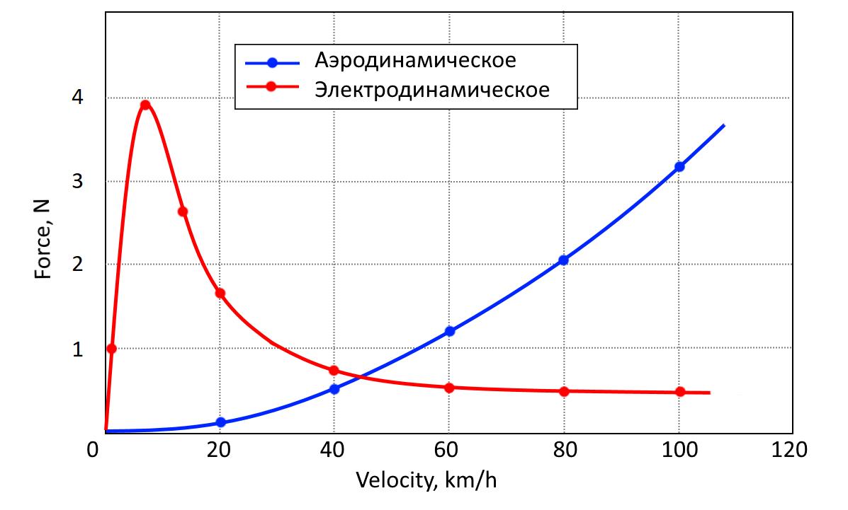 - При прямолинейном движении необходимо учитывать баланс между электродинамическим и аэродинамическим сопротивлением. Для рассматриваемой системы наименьшее энергопотребление требуется для поддержания скорости ~45 км / ч.