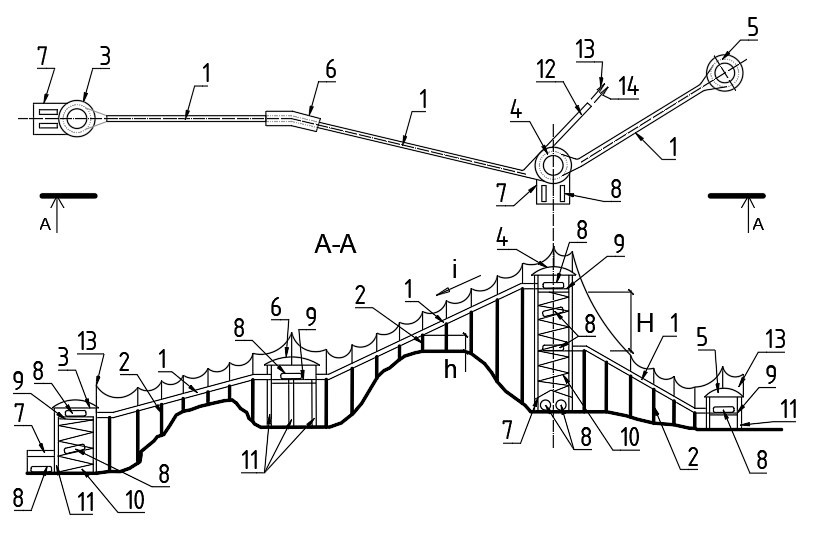 На Рис. 1 представлены конструктивно-технологические элементы или технологическая структура ВСТМ, обеспечивающая возможность ее функционирования на сложных площадках с перепадами высот H и уклонами i. Посредством указанных элементов обеспечивается работоспособность функциональных зон ВСТМ, характеризующихся как уровнем давления воздуха во внутренней полости транспортных труб (1/10 нормального давления воздуха) и соответствующим скоростным режимом движения составов, так и возможностью для составов подниматься на более высокие отметки либо опускаться вниз, например в депо.