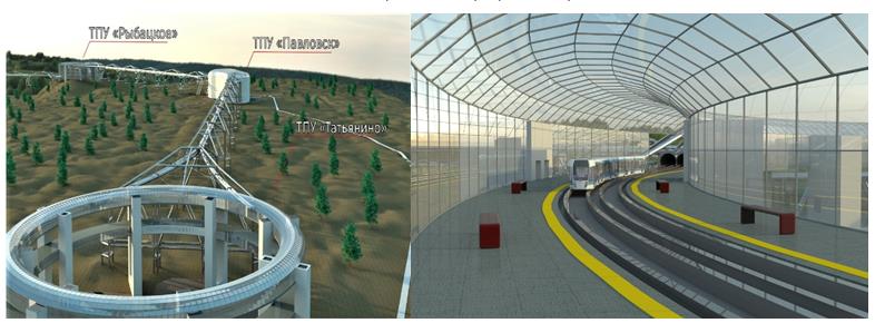 Рис. 3. Визуализация участка ВСТМ с ТПУ «Татьянино» (Гатчина) и интерьер перрона с пассажирским составом на разворотном кольце ТПУ «Татьянино»