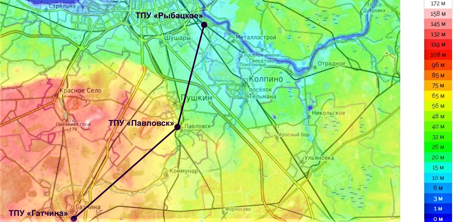 Рис. 4. Принципиальная схема магистрали на участке ТПУ «Рыбацкое» – ТПУ «Павловск» – ТПУ «Татьянино» (Гатчина) на физической карте с высотами местности