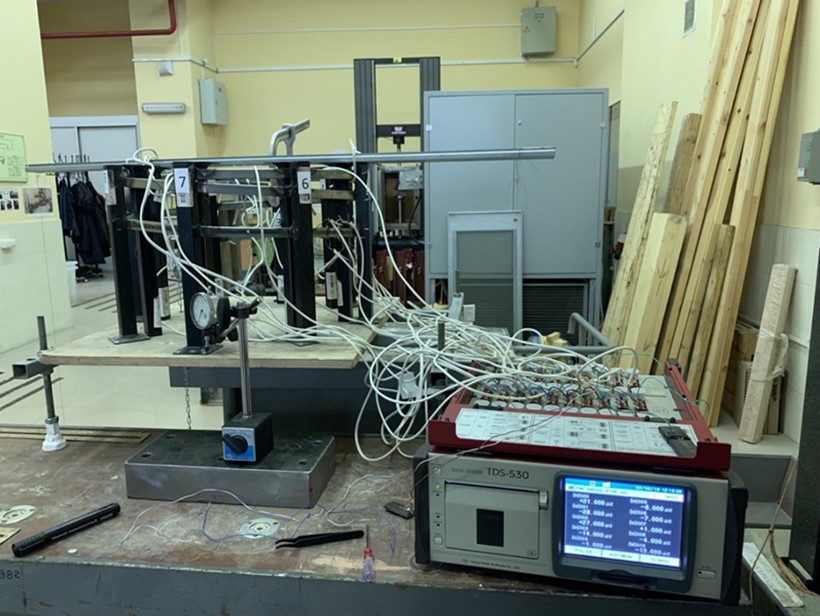 В феврале 2022 года в Механической лаборатории СПбГАСУ имени профессора Н.Н. Аистова завершен модельный эксперимент для выяснения распределения усилий между элементами в сложных зданиях круговой формы. Целью эксперимента стало сравнение полученных результатов с теоретическими с подтверждением гипотезы о возможности расчета элементов кольцевого пандуса как кольцевых балок с жесткими опорами, что значительно упрощало понимание работы такой конструкции и ее проектирование. В процессе исследования принята модель ТПУ в масштабе 1:500 на основе первого варианта (Рис. 1), сваренная из стальных профилей коробчатого сечения размером 25х25х2 мм для стоек модели и 16х16х1 мм для балок пандуса (Рис. 6).