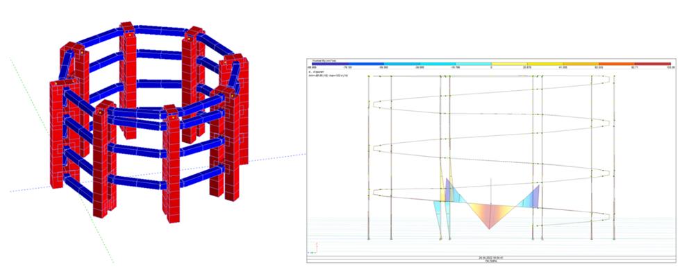 Рис. 7. Расчетная пространственная модель и результаты расчета в ПК LIRA 10.8