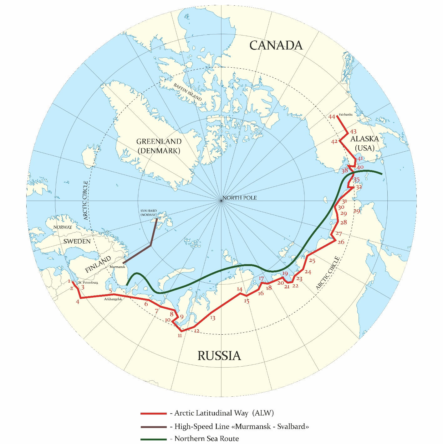 На этой основе, представленной в предыдущем разделе, разработаны решения по высокоскоростной Арктической транспортно-энергетической магистрали (АТЭМ). Магистраль берет свое начало в Северо-Западном регионе России (морской порт Усть-Луга), проходит по Ленинградской, Вологодской, Архангельской областям, Заполярному региону Европейской части, Сибири и Дальнего Востока, через Берингов пролив и заканчивается на Аляске, соединяя собой два континента.