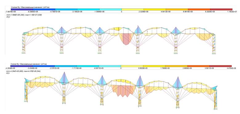 Рис. 9. Сравнительные расчеты арочно-вантовых конструкций АТЭМ на ПК LIRA10.8 с малым уклоном i=0,003 (верхний рисунок) и максимально допустимым уклоном i=0,040 путепровода (нижний рисунок); представлены эпюры моментов в пятипролетной раме из арок пролетом 180 м, загруженной в середине