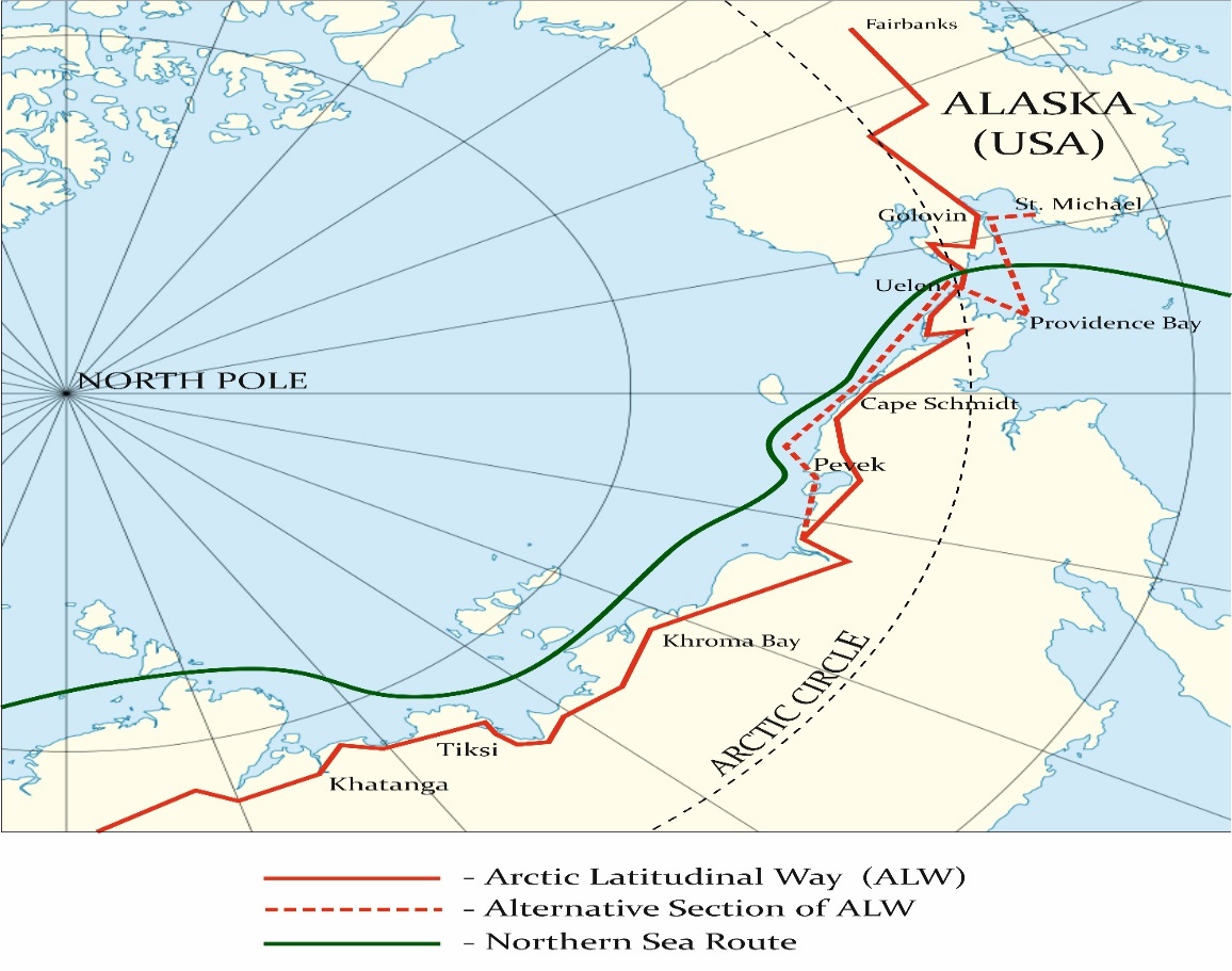 Results: according to preliminary technical and economic indicators, the duration of cargo delivery along the Arctic Expressway to the Bering Strait is reduced by 5.5 times compared to the Northern Sea Route (NSR), and passengers by almost 30 times, but at the same time the length of the projected expressway is almost 1.6 times higher due to the need to bypass high coastal mountain ranges.